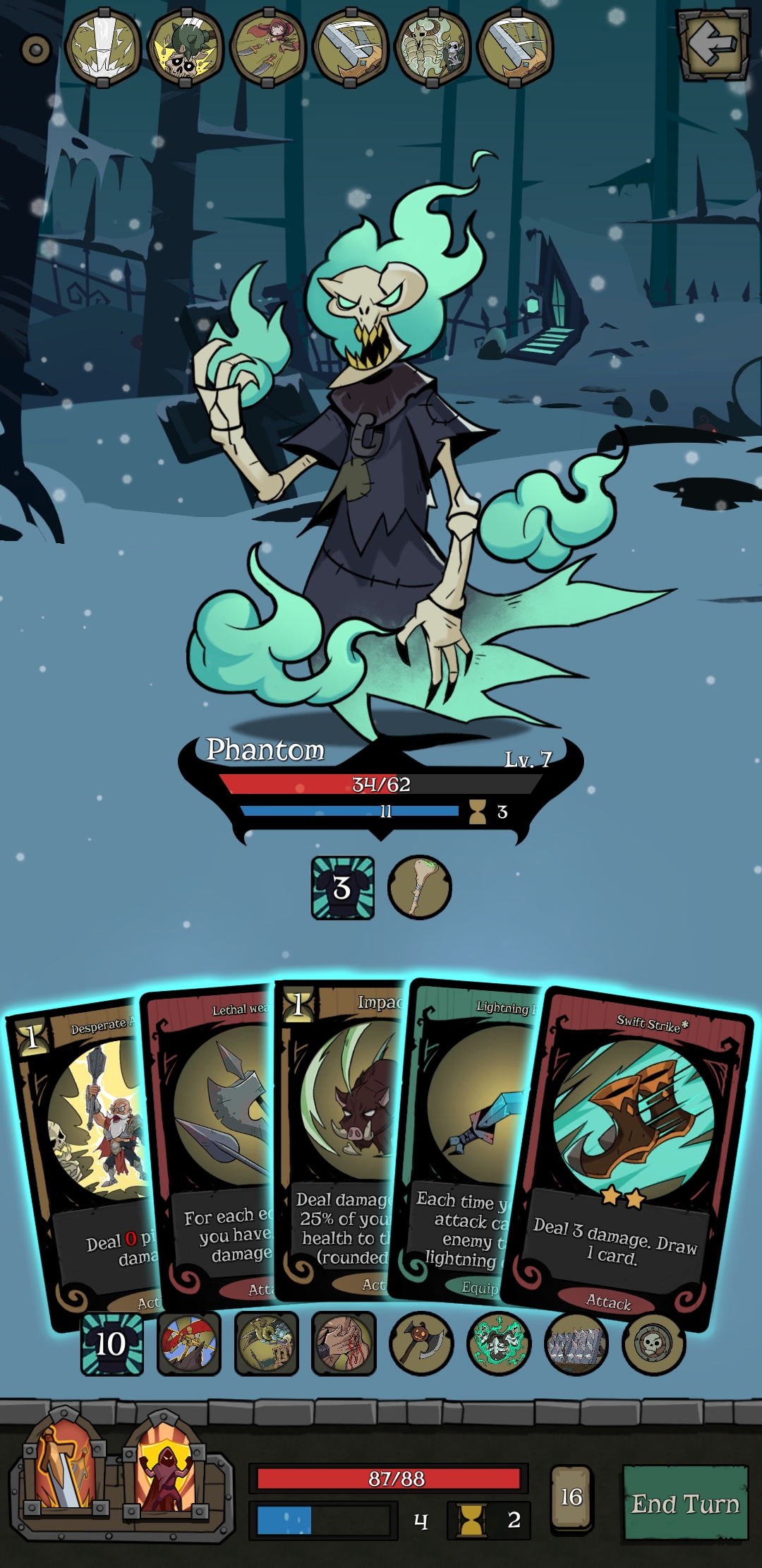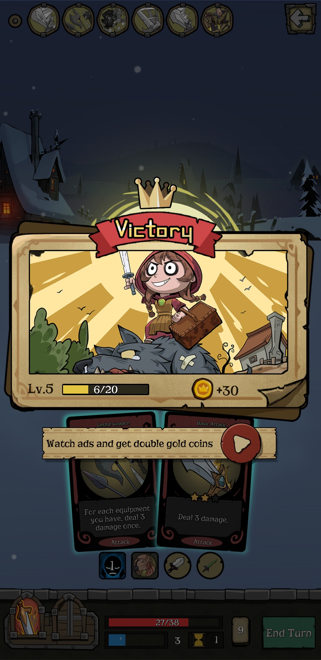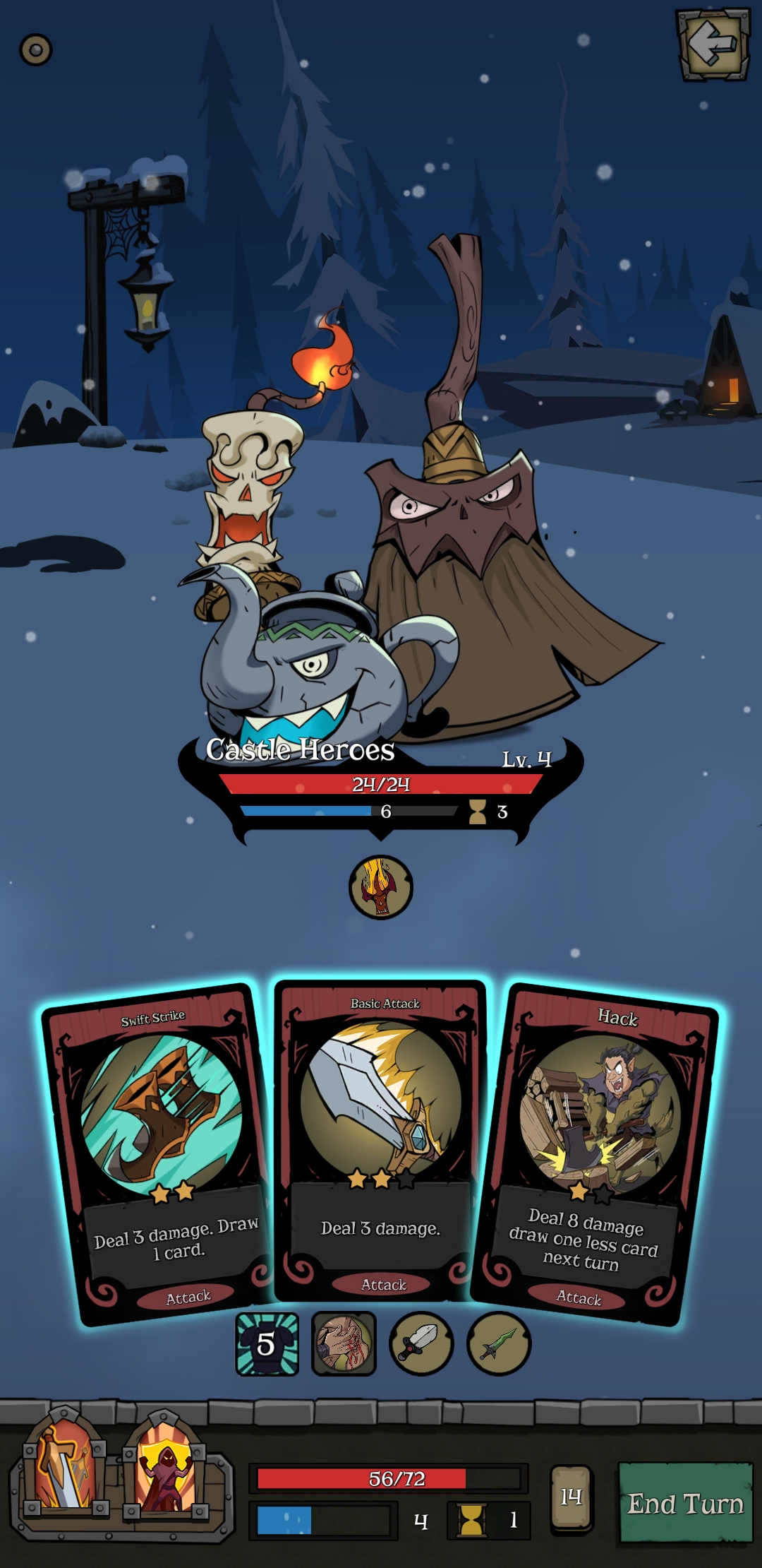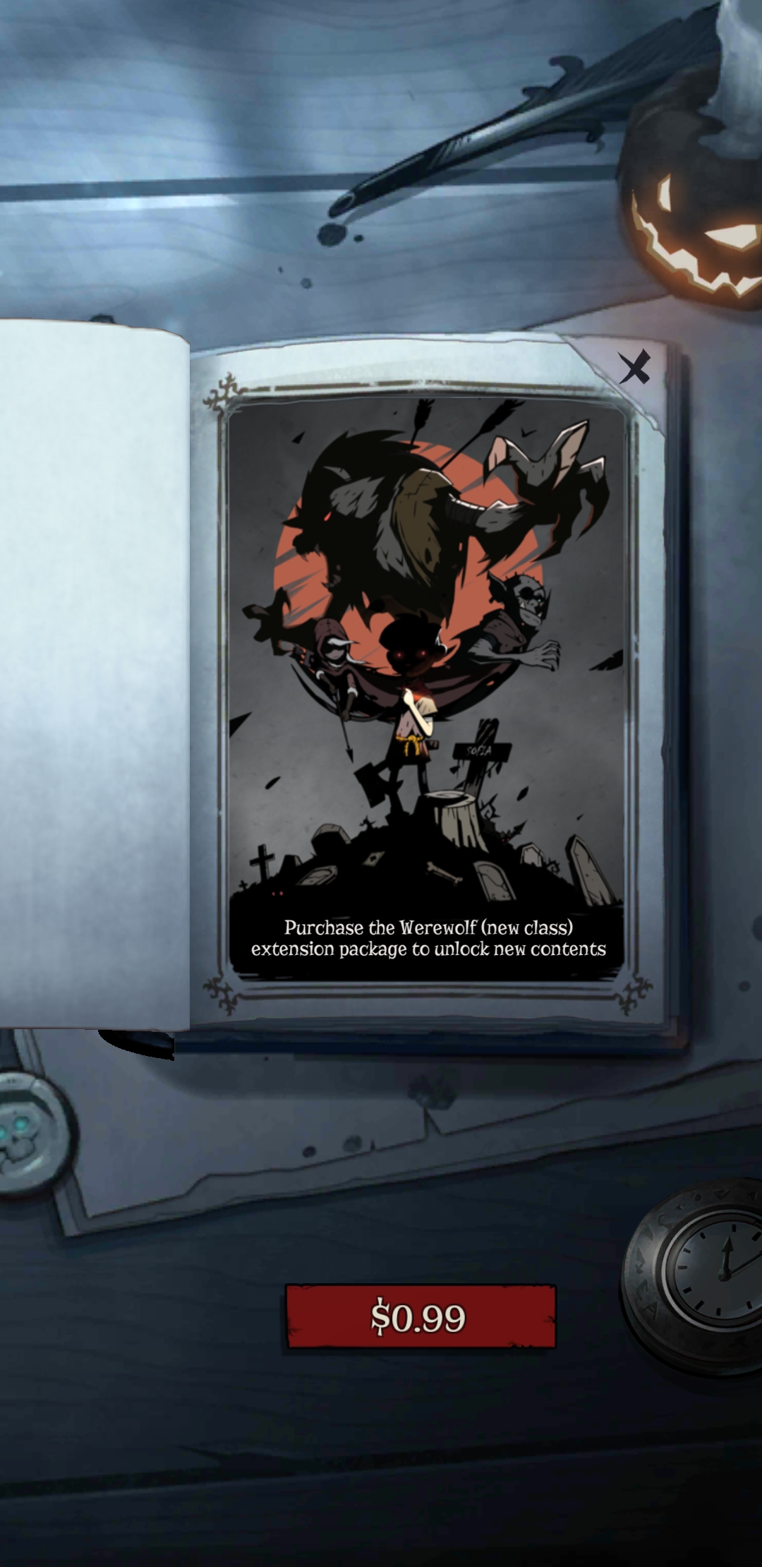 Night of the Full Moon features a clean artstyle and nice user interface. Cards (in hand and in the top history bar) as well as effects can be pressed to bring up tool tips and explanations of keywords. Fitting in with this, there are no ads on screen while the player is playing. Ads are entirely voluntary at the end of chapter boss fights to double the gold given for victory. There’s no pressure to put more money in and the entire first chapter/class of the game can be played unlimited times without paying.