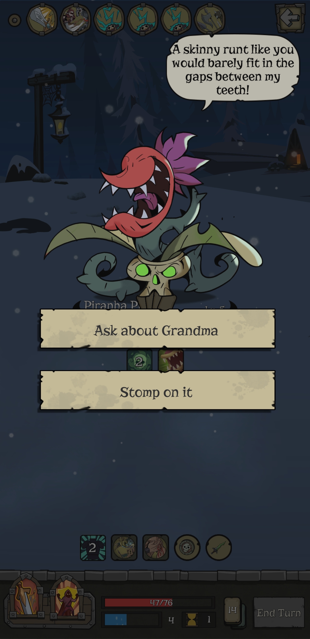 Characters in Night of the Full Moon are a mix of some traditional enemies such as Devil, Phantom, or Treant, along with some more humorous characters such as Lusty Quagmire and Pig Widow. After defeating an enemy, there’s a chance players will get dialog options with the defeated character which can result in gaining or losing Reputation, Courage, Health, and Gold. The game will mark answers explored on previous runs with their outcomes. Gaining enough Reputation or Courage leads to small benefits. Stories behind these characters can be explored in the index, but like much of the story related text it’s full of minor translation errors. Card text is free of such issues as far as I’ve seen.