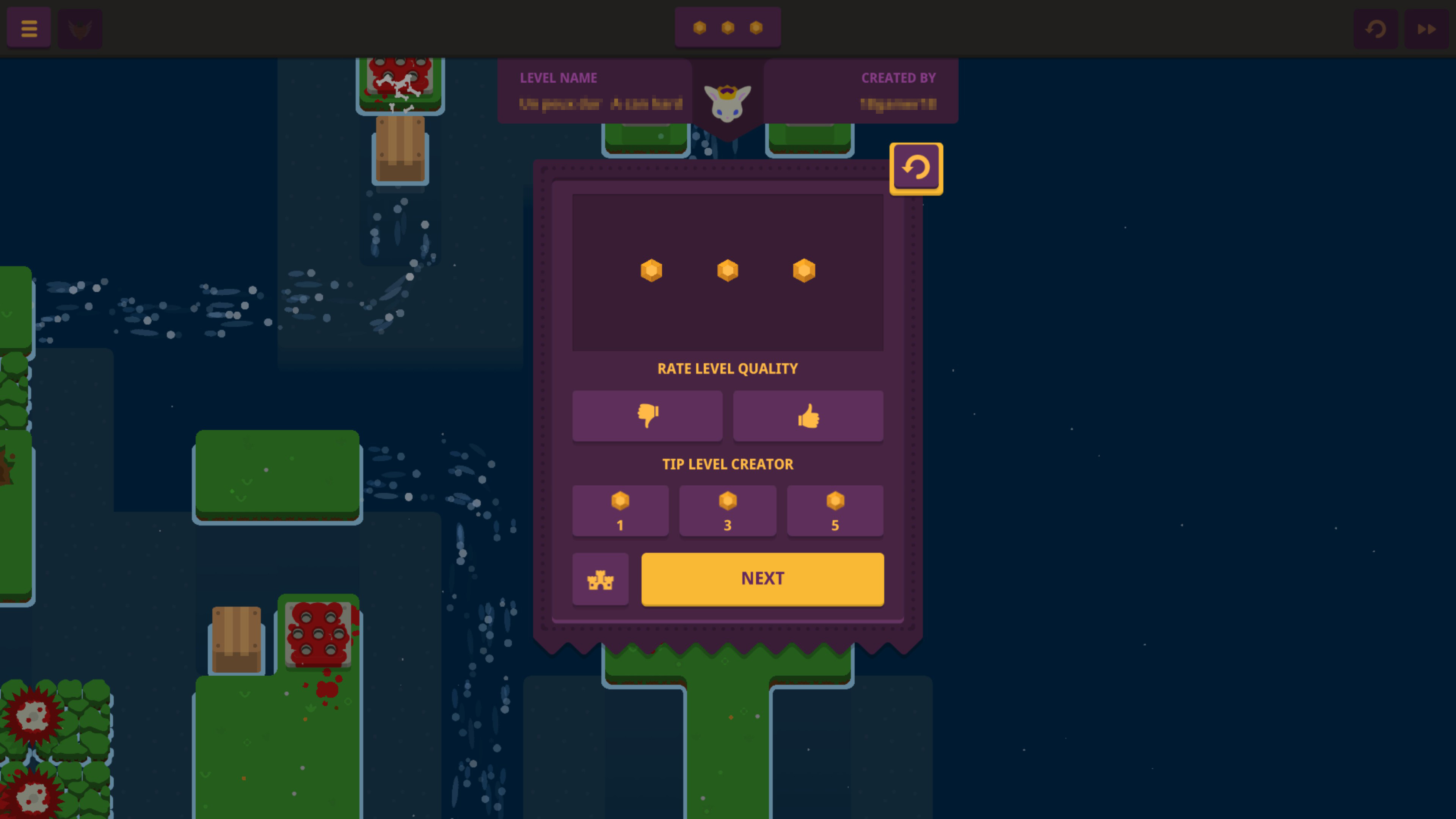 After the tutorial, the only option is the play random player levels. There’s no way to browse or search for levels with certain characteristics. Which also means there’s no telling how hard of a level a player will get. Players at both the high and low spectrum of skill / stubbornness may find themselves skipping levels. It’s not easy to tell how hard a level is. If a level is larger than the screen, there’s no way to zoom out or pan around the camera. There’s also no limit on how long a level might take to beat and there are no checkpoint options.