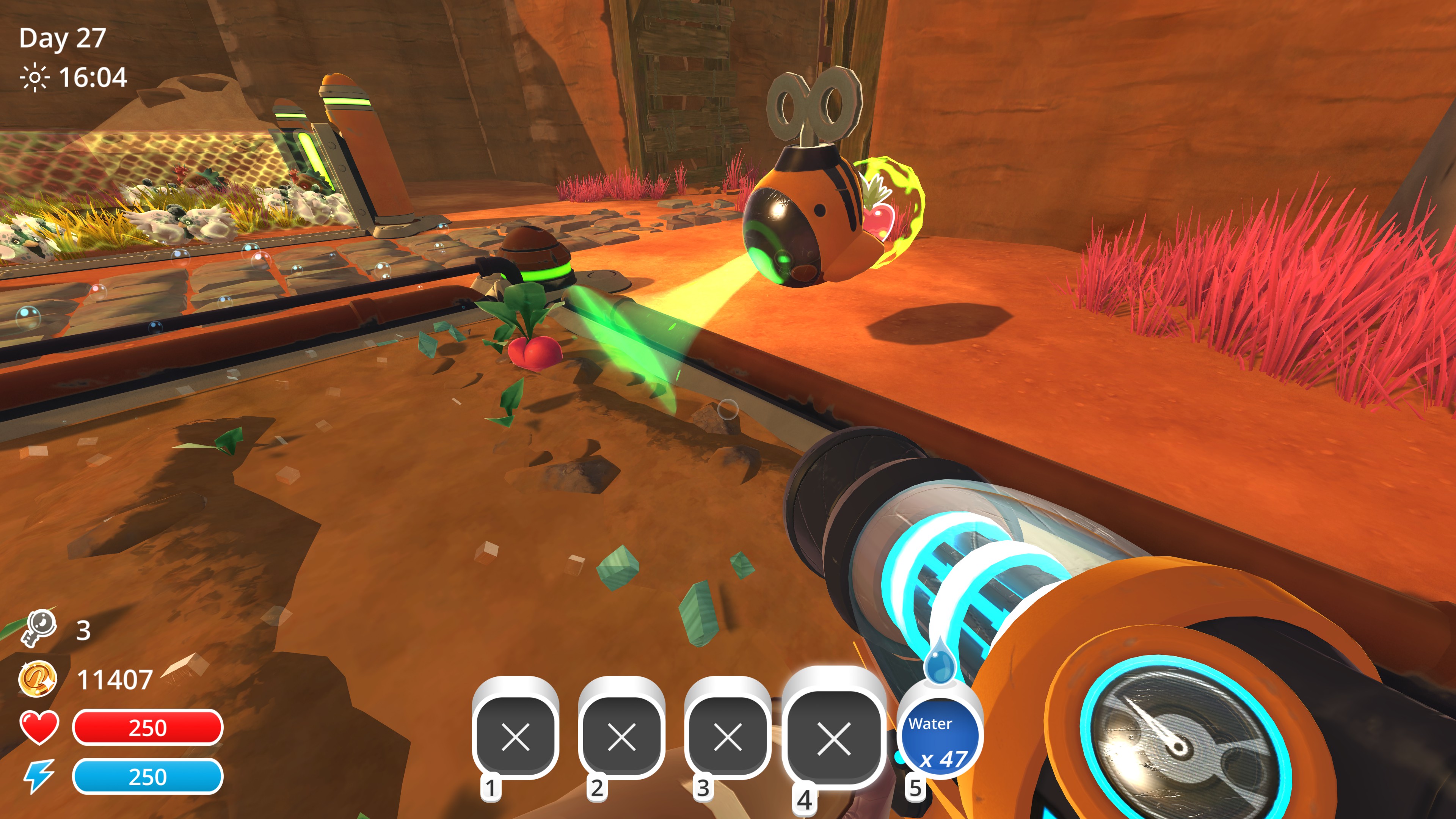 The main foci of Slime Rancher are exploring the multiple biomes and collecting slimes. The slimes in the first biome pose very little threat and traversing the landscape requires less use of the jetpack. Players have to collect and care for the slimes to afford upgrades. Upgrades on the ranch allow for easier care of more and more slimes, while personal upgrades give bonuses like additional stamina and health and longer jetpack usage. By exploring hard to reach places with the jetpack, players can discovered secrets to progressively unlock more of the map. With each new biome comes new slimes, new plants, and new science resources as well as progressively more vertical terrain.