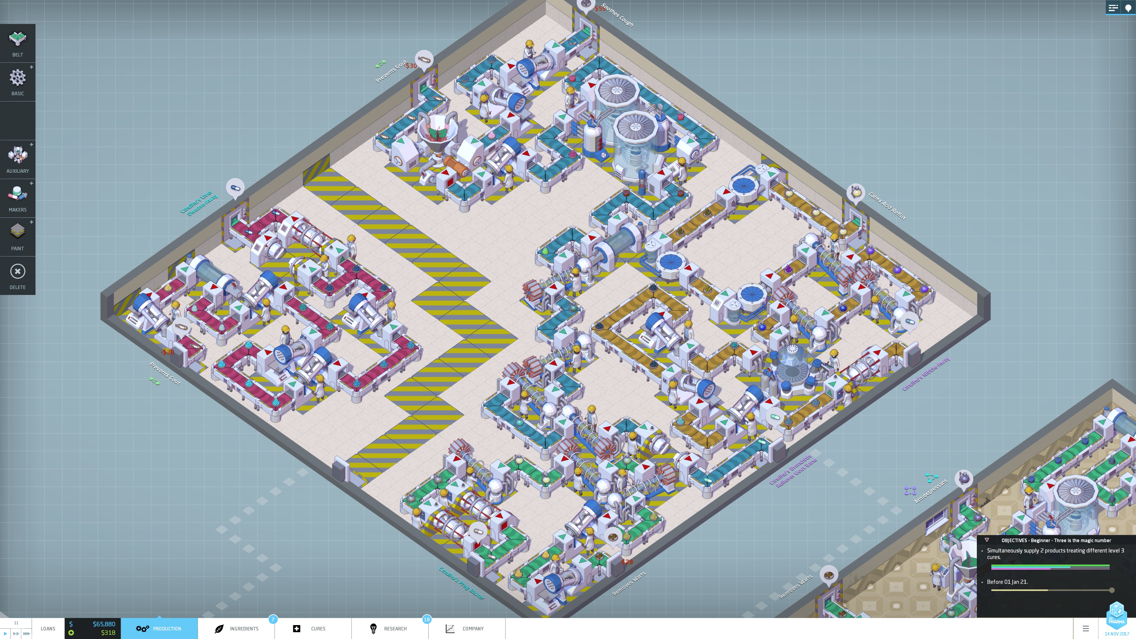 The biggest draw for me in Big Pharma, is the ability to create complex assembly lines to create a variety of substances with different strengths, side effects, and cures. I enjoyed trying to figure out how to best utilize my warehouse space while also trying to reduce as many harmful side effects in my drugs as possible. The different machines available all have set shapes, so players often have to work within the constraints of how the machines can be orientated. Even once more powerful machines have been researched, it may be beneficial to use up extra space with a string of weaker machines that cost less to run. I loved the tug and pull and constantly making decisions to improve efficiency.