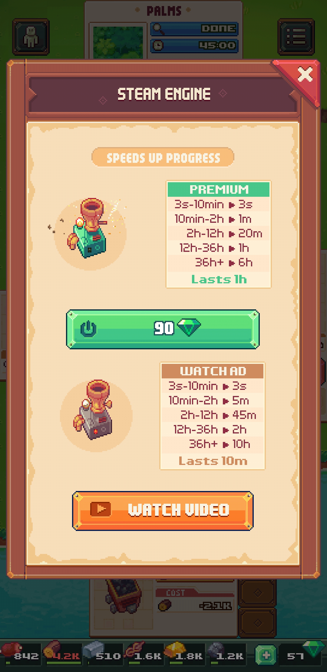 As I find to be typical of timer based games, the timers do tend to get long enough that using the ad based speed boosts seems advisable. The timer system is rather generous, reducing all timers based on a band. For example, all timers less than 10 minutes become 3 seconds, between 10 minutes and an hour becomes 5 minutes, etc. This was much more pleasant than other systems which require ad watching for each timer individually, especially when the colony of survivors grows in number and they may all be working on separate tasks.