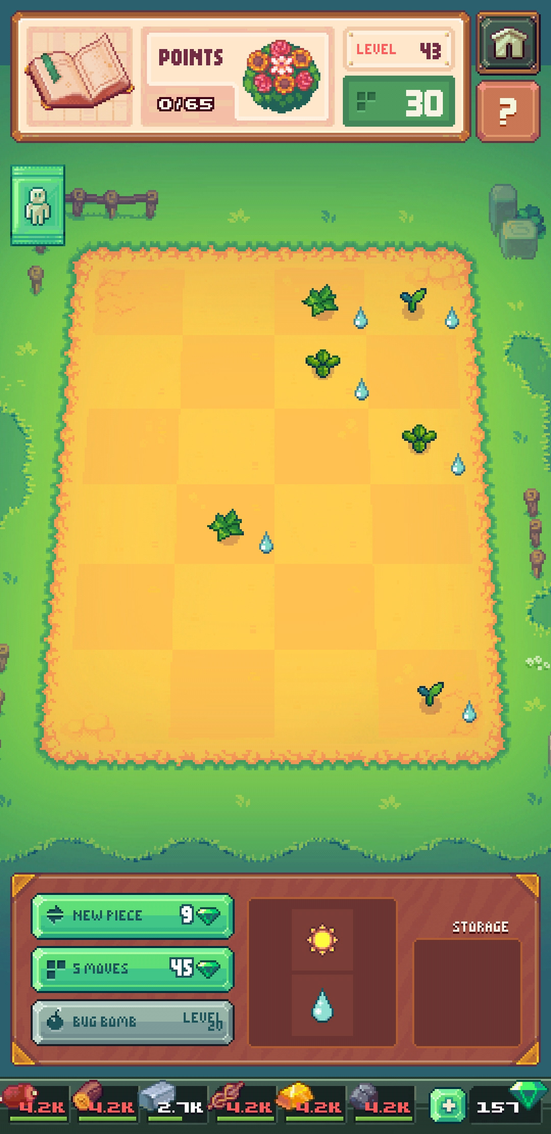 Tinker Island also introduces a freeplay garden puzzle after a short ways into the story. It allows the player to play a simple geometric game of arranging seeds, sun, and water to grow flowers. No timers or resources are needed for playing the garden puzzle, making it ideal for spending time when waiting for other timers. Successful completion of levels provides bonus survivors, either permanent or one time use.