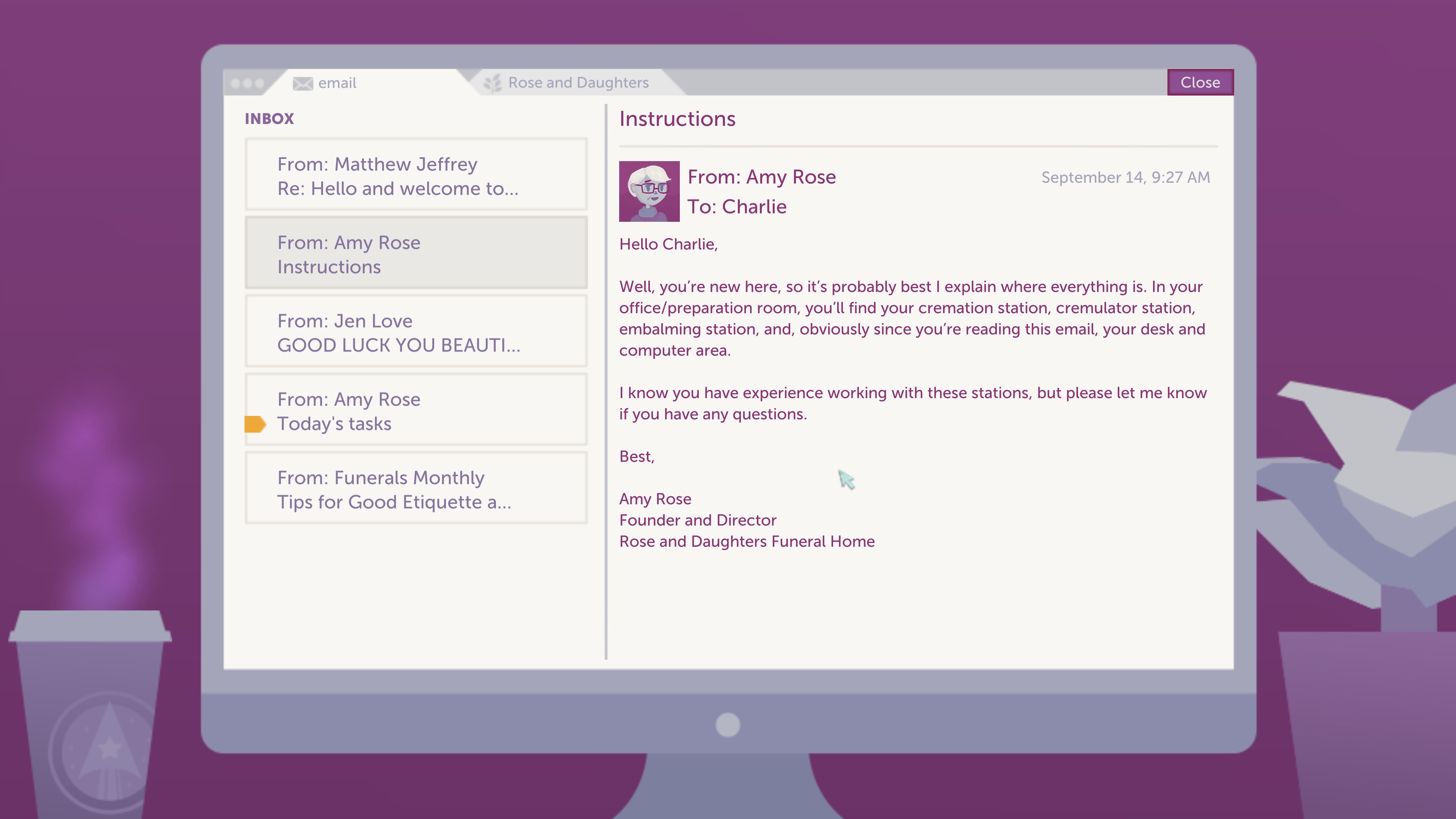 A Mortician’s Tale follows the story of Charlie, a new mortician working at a small funeral home. Players follow through a sampling of her days across about a year. Most of the story comes through emails she receives from coworkers, her best friend, and a monthly newsletter about death practices. The additional story comes from listening to the families of the deceased at the funerals. Charlie herself is a silent character with limited personality, but the other characters become reasonably fleshed out for the length of the game. I enjoyed the diversity of the recurring cast and felt the game did a good job of making the player hate characters they were supposed to.