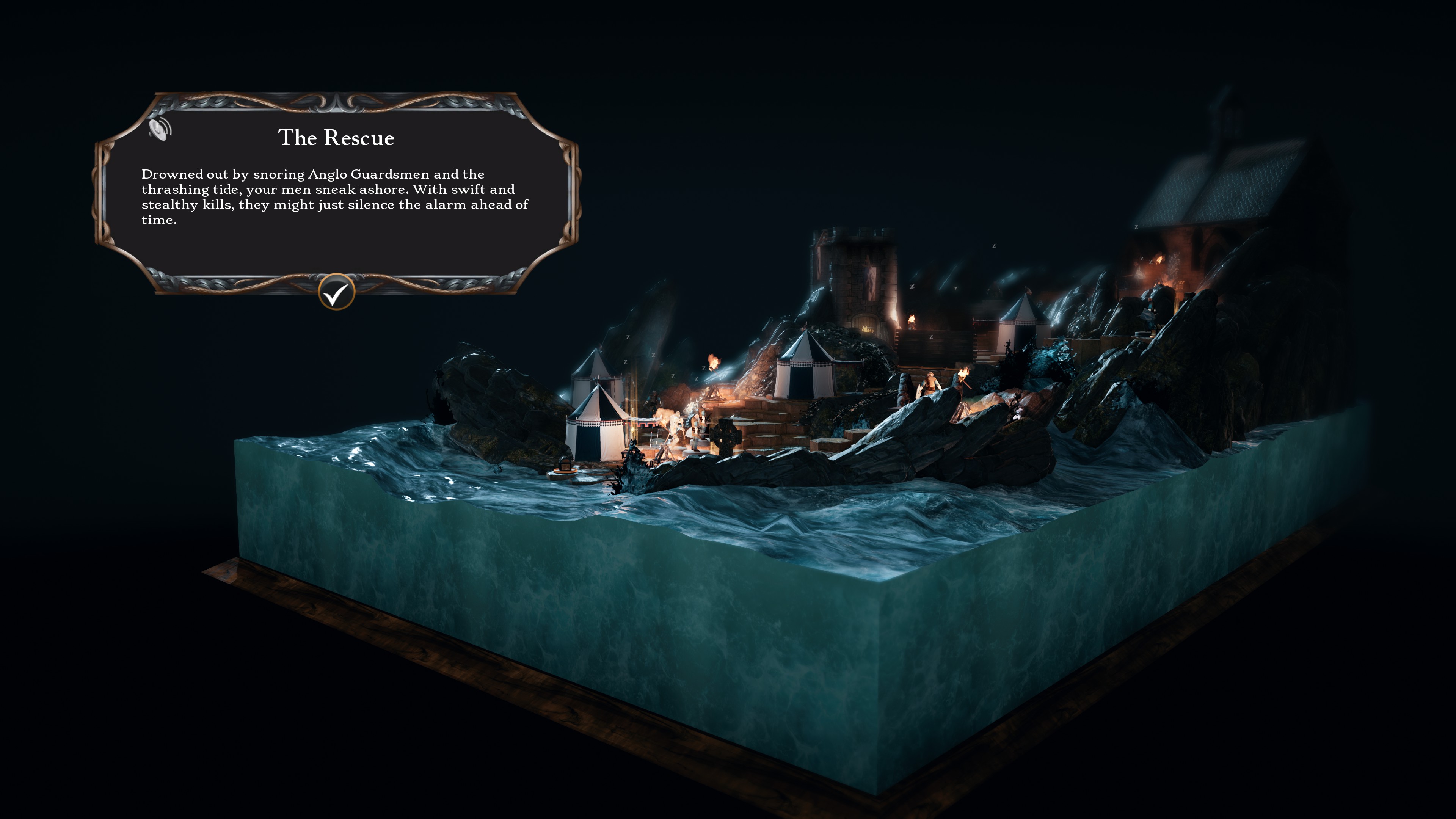 WARTILE is divided into multiple levels called boards. Each board is non-linear and 3D, sometimes with underground areas. Each board can be completed at three difficulty levels and typically takes 10-20 minutes to complete. Based on completion time, optional objectives, kills, etc the player will also receive a score, although this doesn’t appear to have any effect on the rest of the gameplay. Many boards introduce new mechanics such as special tile types (cracking ice, enemy spawn points, etc.), wave battles, stealth and alarms, escape sequences, lightning strikes, and boulders for crushing enemies. I found the various boards to all be unique, engaging, and visually pleasing. My only complaint was that there was no level with a party cap high enough to let the player take the full warband of figurines into battle once they were all unlocked.