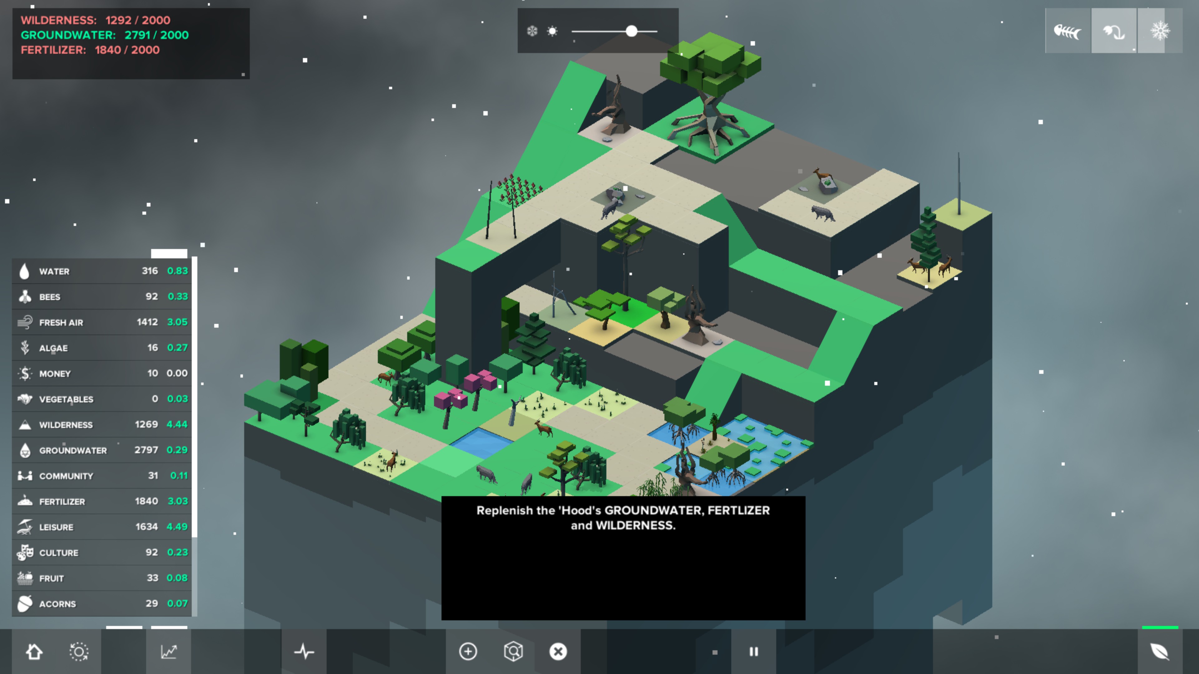 The buildable space in Block’hood is called a Hood. The size of a Hood does not change while playing, but all resources are shared across the Hood. Hoods can have events such as rainfall, which are visible on the upcoming timeline and can have different effects such as an increase in water resources. Hoods also have seasons that change the likelihood of different weather events. Non-random events such as rancid waste can be triggered by meeting certain conditions like having too much organic waste. They can be removed by meeting their exit conditions. Other events can include predators moving into the Hood if there are a lot of herbivores living there. When it comes to inhabitants like people or animals, the Inhabitant Database can show players any recipes they’ve discovered on how to attract certain people or animals.