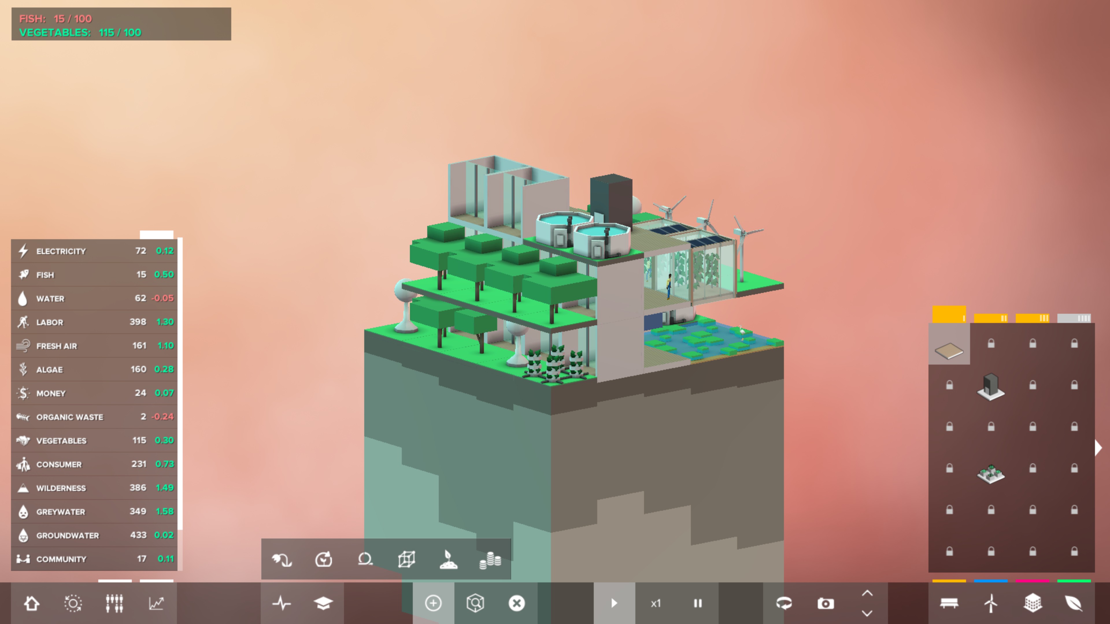 Overall, I really liked the vertical building and sustainable focus of Block’hood. I enjoyed the different modes and variety of blocks and resources. The controls were simple to learn and well adapted to working in a fully 3D space. Although I did have some minor annoyances, like trying to sort through the long list of resources for ones I didn’t want to be accruing or wanting to move blocks instead of destroying and recreating them. I recommend Block’hood for players interested in a lighter weight building and management simulation.