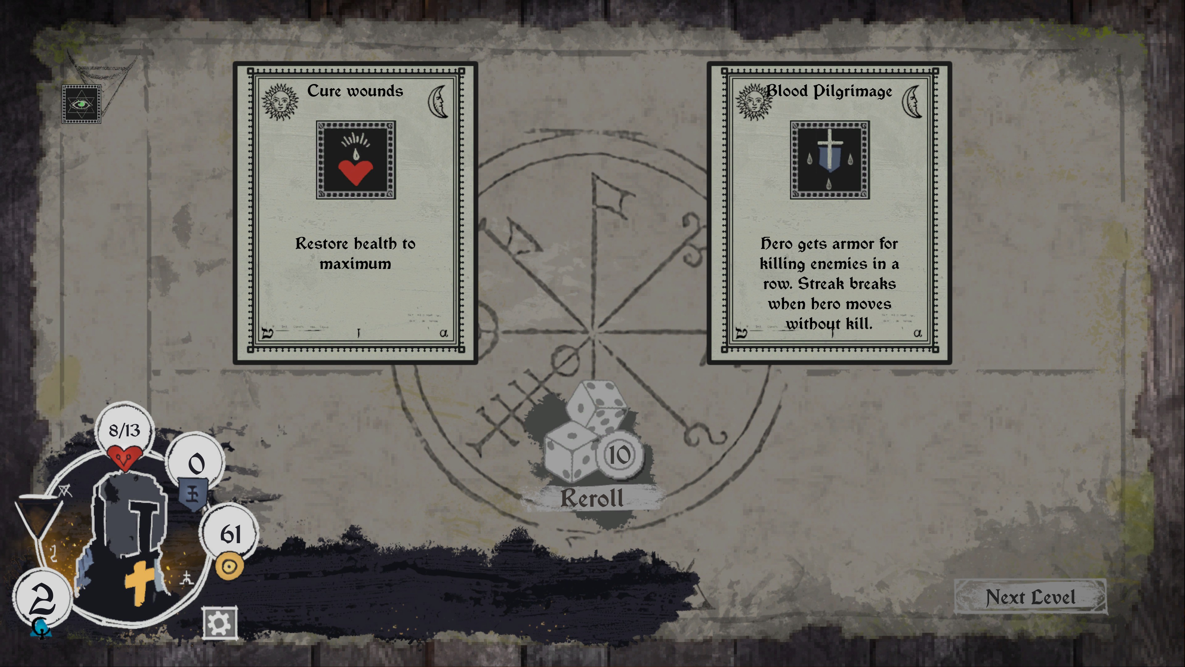 Some of the mechanics of the game were not fully explained. For instance, in the user interface, it’s not clear that the second value represents shields and what the use of gold is. It’s also not clear that there’s a limit to five spells in your inventory. More frustrating for me was that the player cannot view what perks they have during a level, only between levels. Other mechanics, such as the fact a player can only have a single aura perk are not explicitly called out. The player has to stumble into figuring this out themselves.