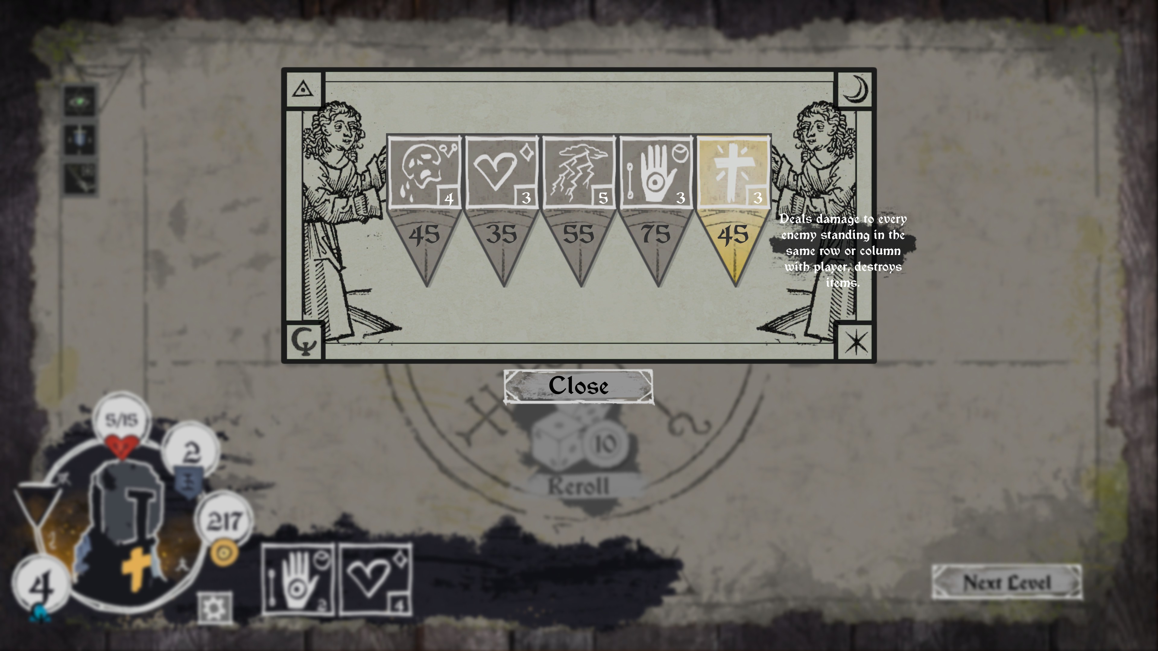 Heretic’s Lot: Prologue is a unique blend of roguelite, grid-based tactical, and turn-based puzzle. Players operate in a five by five grid populated with coins, health potions, shields, battle spells, and a variety of monsters. Some of these items may be obscured inside of crates. The player can pick up single-use battle spells for effects such as healing themselves, damaging enemies next to them, or teleporting to a new location on the board. As the player moves around the board, the square they leave will be taken up by shifting the current occupants of the board toward the player and then generating a new square on the outside edge of the board.