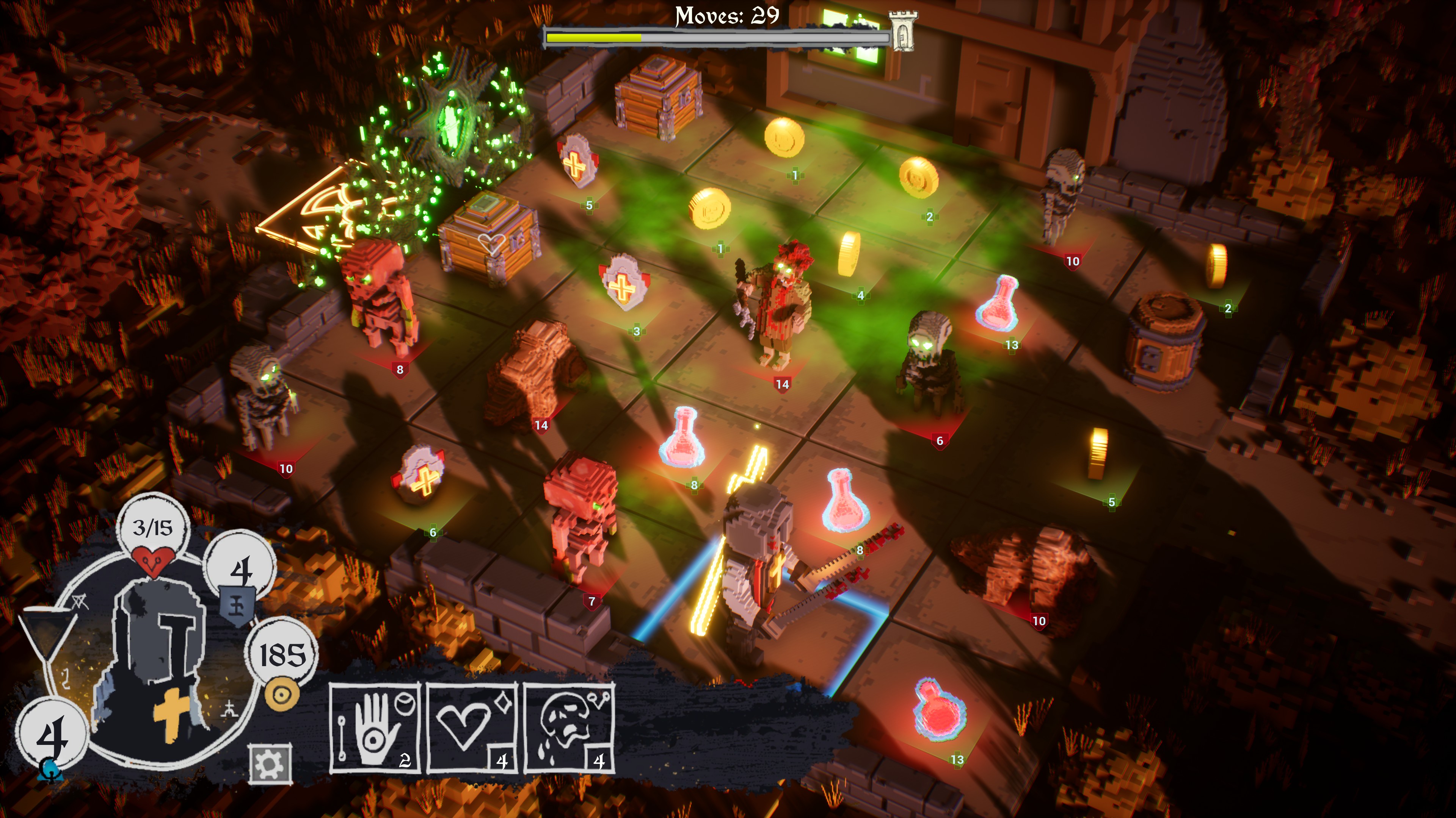 In each level, the player must survive a certain number of turns before a boss is summoned. In which case they must defeat the boss and exit the board through the top left. In order to survive, players must maintain their health either by building up shields or healing damaged with health potions. They will often be forced to fight monsters which can deal different amounts of damage to the player. They may also break open crates in order to reveal new monsters or items to use. If the player’s health ever reaches zero, the run is over and the player must start a fresh run.