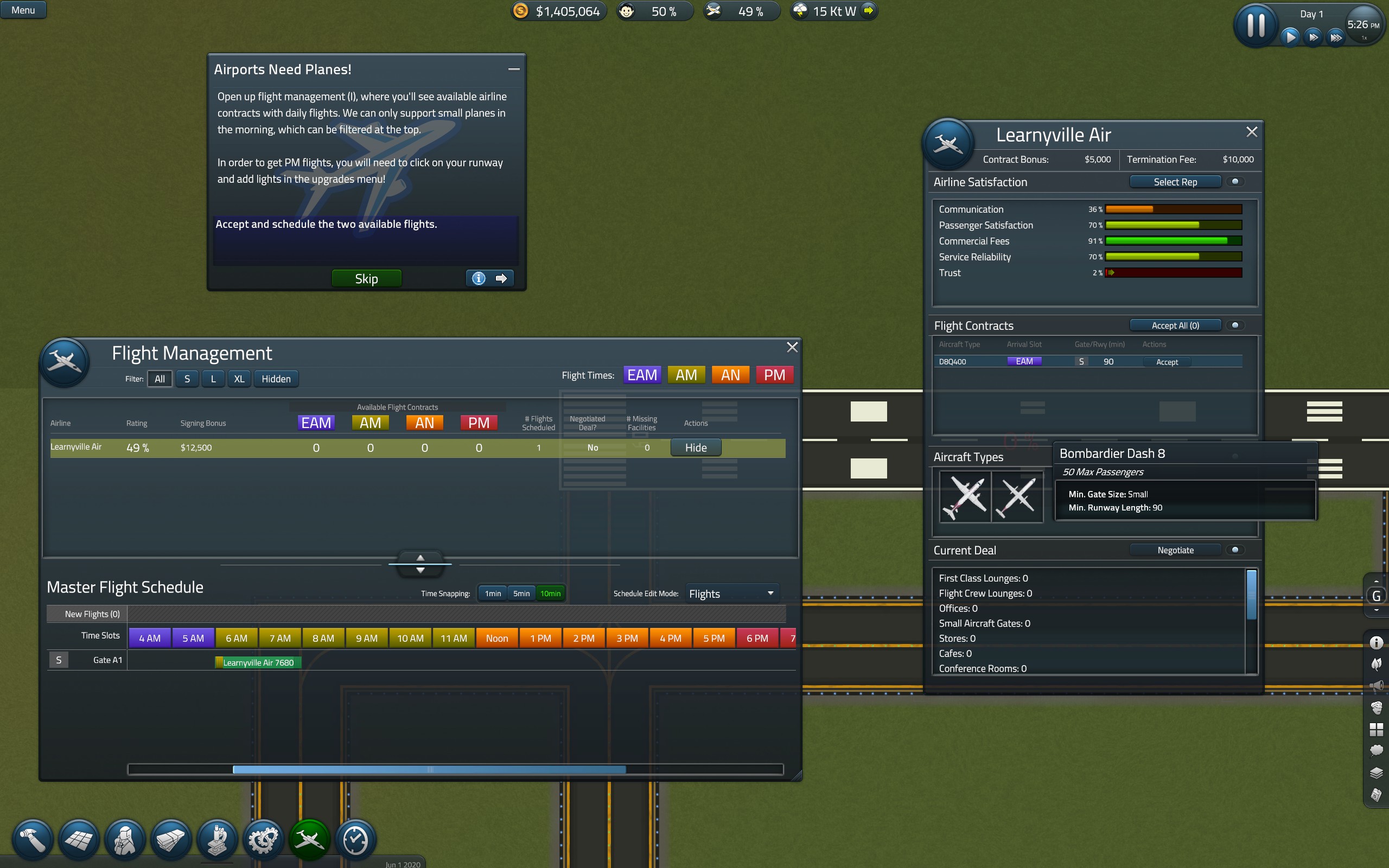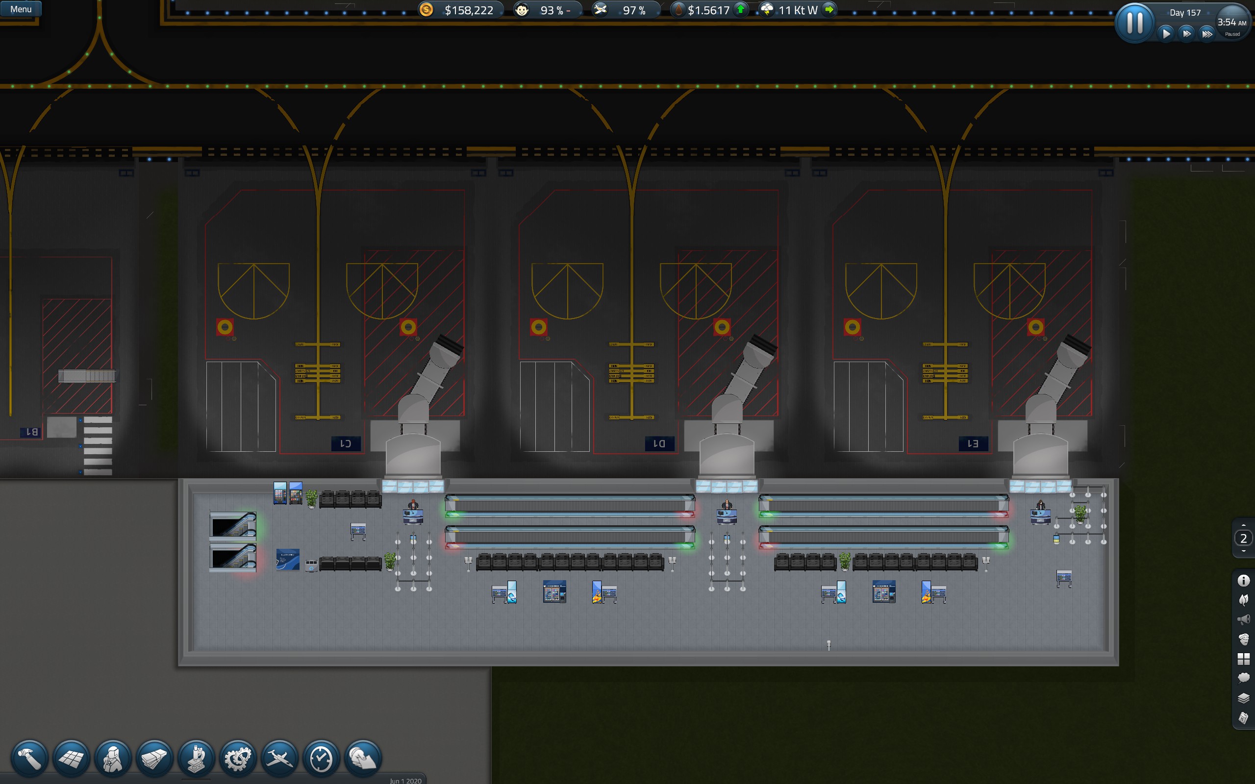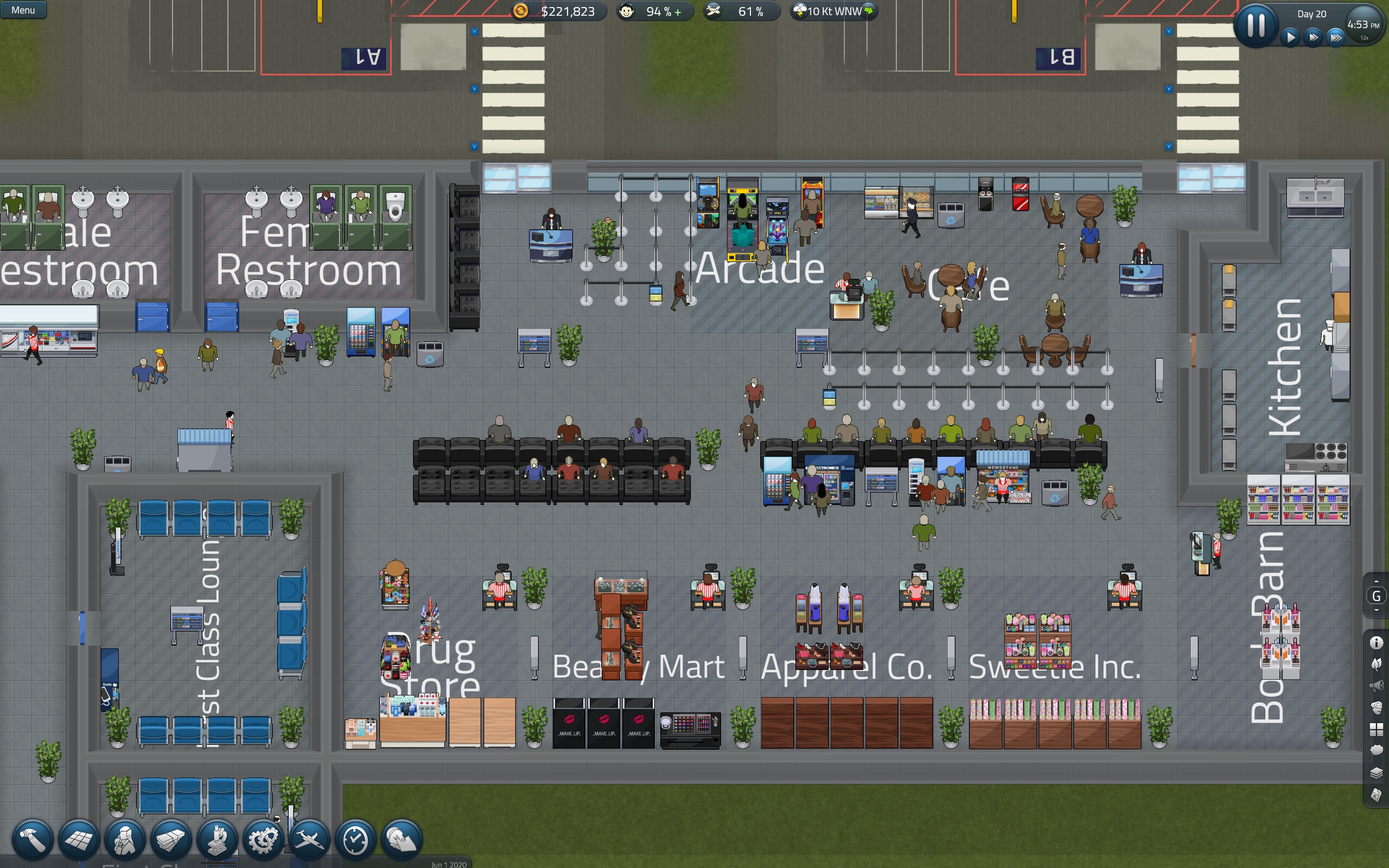I was pleased that there were many simulated aspects of the airport. Everything from negotiating with airlines in order to give them dedicated offices, restaurants, and first-class lounges, to maintaining oil pricing and fueling, running underground baggage lines, organizing kitchen prep to service cafes, and optimizing security throughput. Probably the biggest pain for me was the early game of the airport. There’s no way to skip over downtime when the player first starts out and they don’t have the ability to accept flights in the dark and there’s no way to skip over the night. The player has to sit with max fast forward and wait for nearly a minute for the night to pass every night until they can get lights in on their landing tracks. I also found that the player ends up sitting around a lot, just waiting for income. Just laying the foundation to build any new structures costs a significant amount of money as is expected, but I found myself AFK with the game on for nontrivial amounts of time, just to get the money, to be able to build something interesting and then leave it running again for a while.