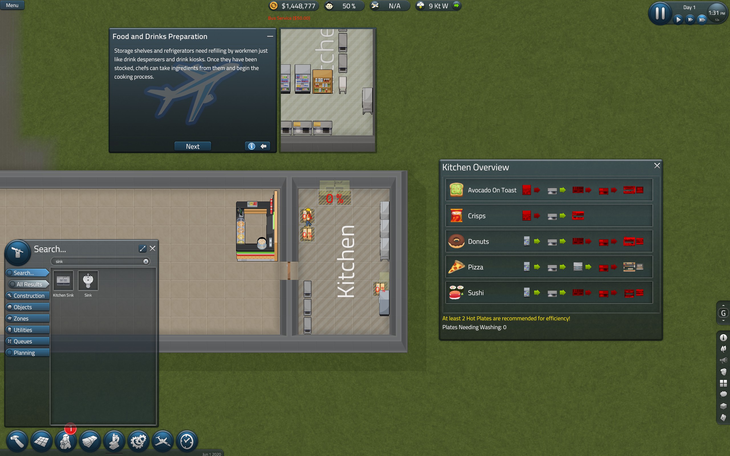 However, there were some aspects of the building that I found difficult. The biggest one was the item organization within the menu where players select items to build. I found it difficult to find things and I really wanted things to be organized by zone. If the player wants to build a ticketing zone, then all the things that probably apply to a ticket zone should be together, or just the ability to search ticketing and find all of those things. In lieu of that, I wanted to know what section an item was in after I found it. Then next time I wouldn’t have to search for it again. For example, I had trouble when I was trying to build my kitchen I wanted to find what I would call a “stove”, but neither that nor “kitchen” found the item because it was called a “cooker”. And then even after finding it, I don’t know what section it would’ve been under to try to find it again int he future. This was true for a lot of things, such as conveyors not showing up when looking for baggage related items.