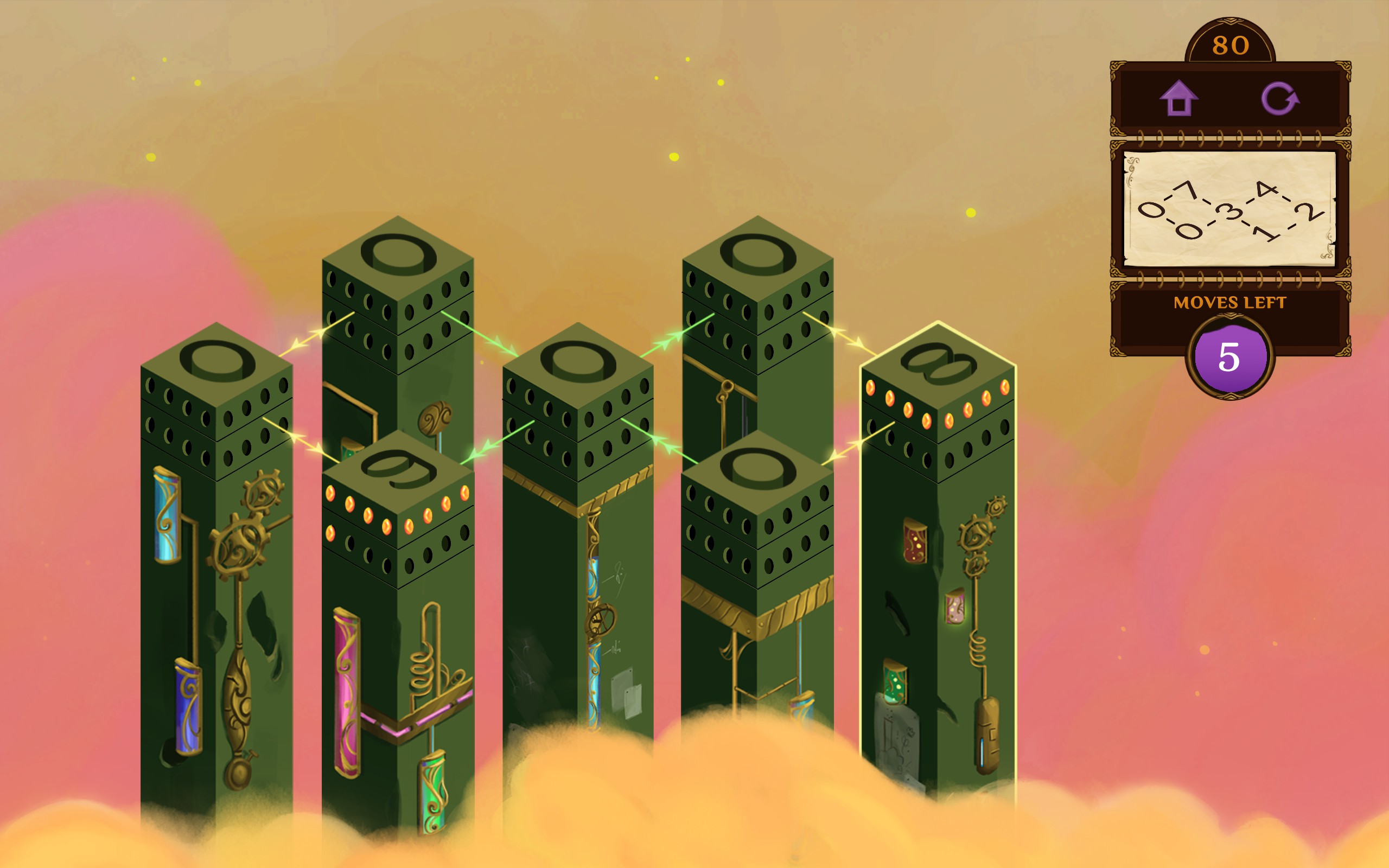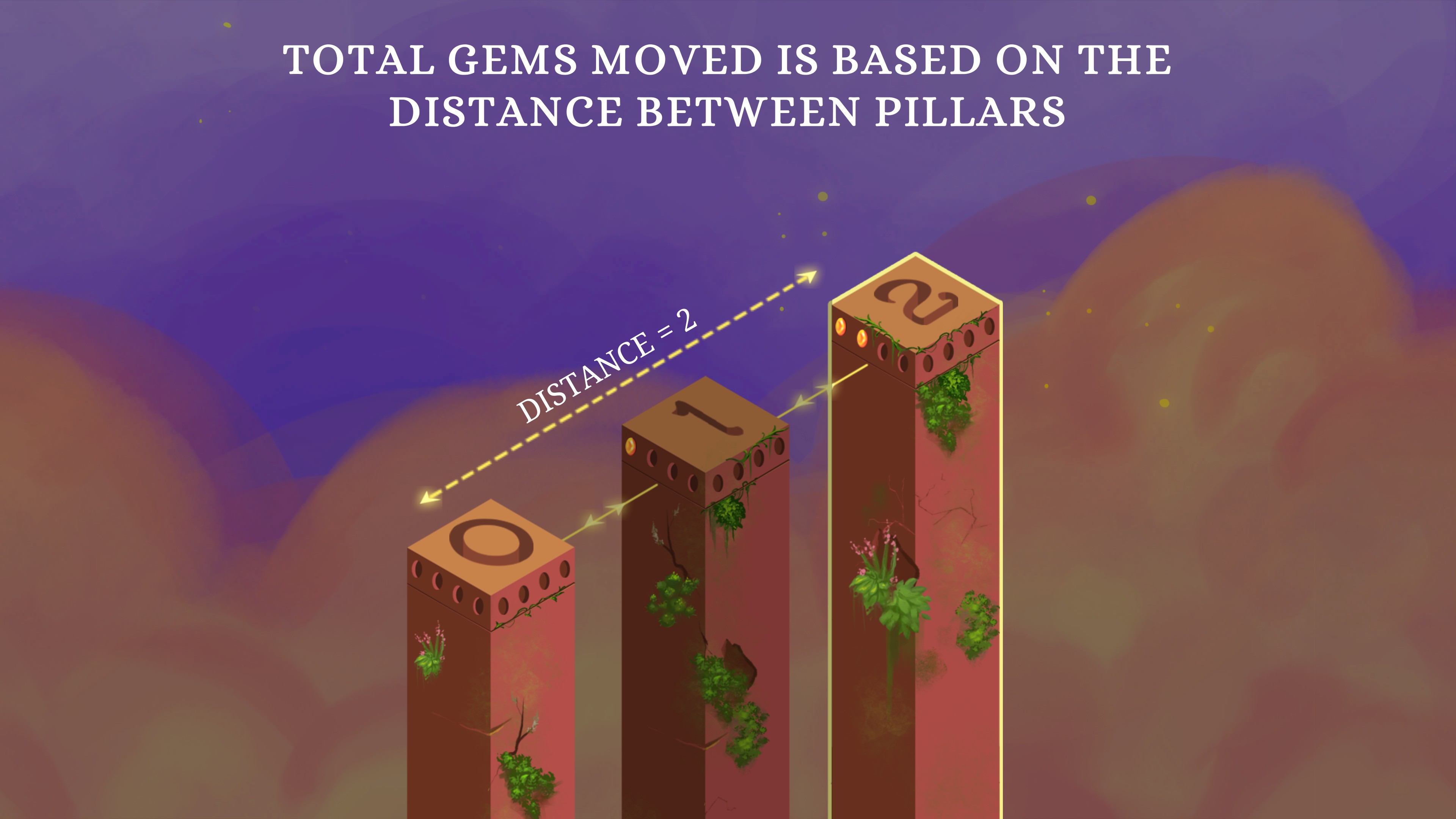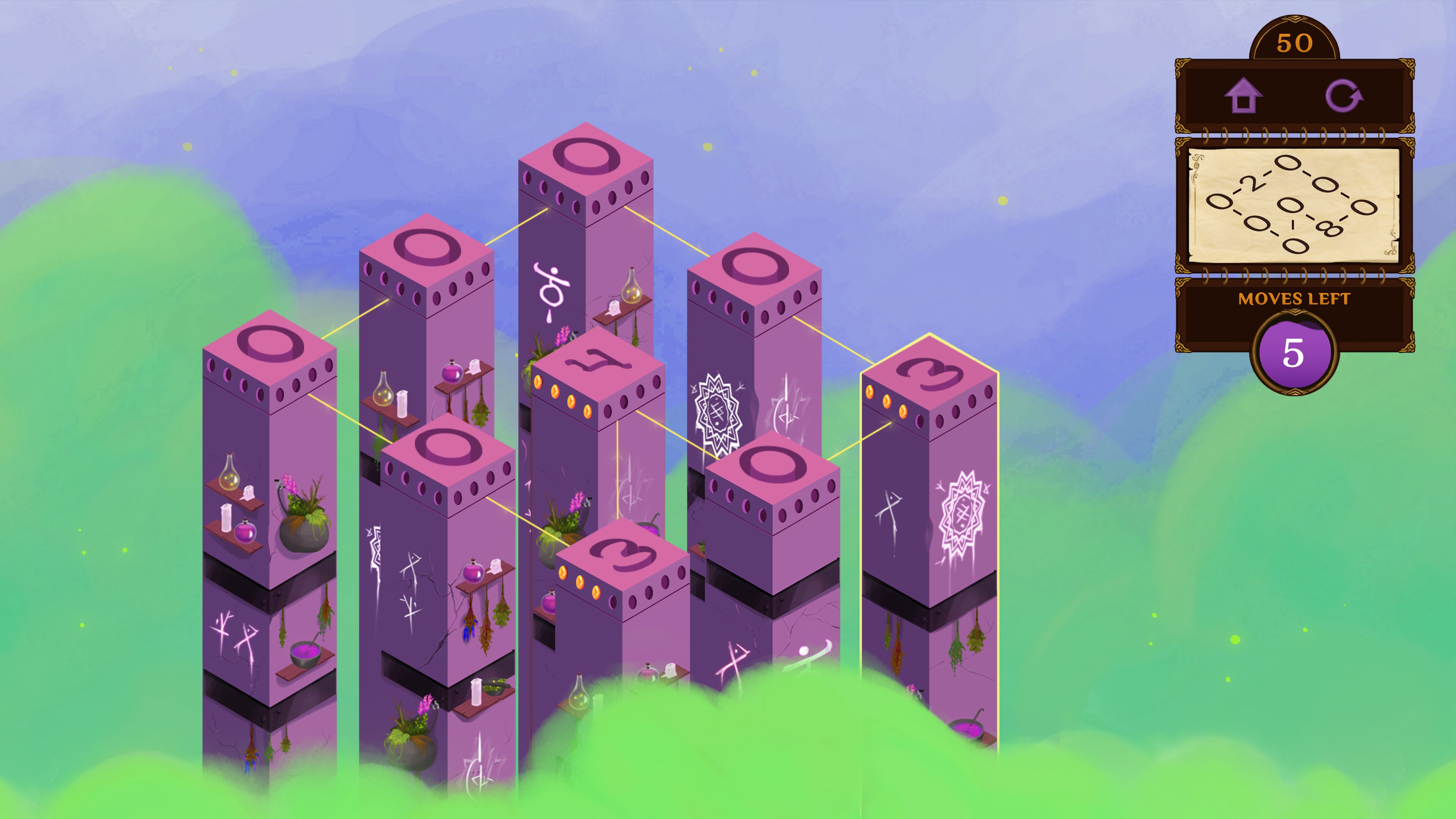 Mystic Pillars has a unique puzzle mechanic. Players have a limited number of moves to transport gems between connected pillars to achieve the desired arrangement. Gems must be moved in sets equal to the number of pillars moved. That is to say, in order to move over to pillars, two and exactly two gems must be removed from the starting location.