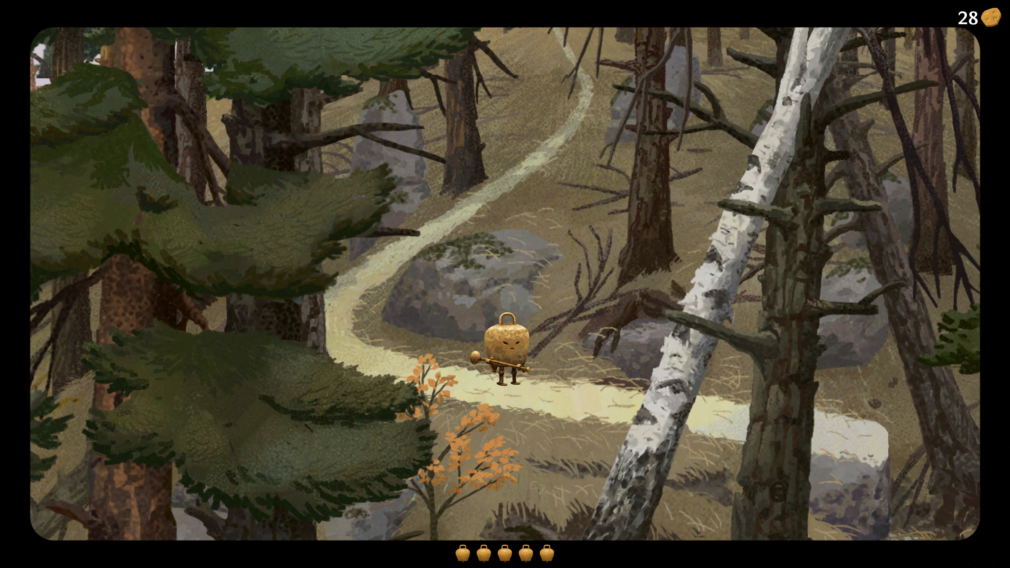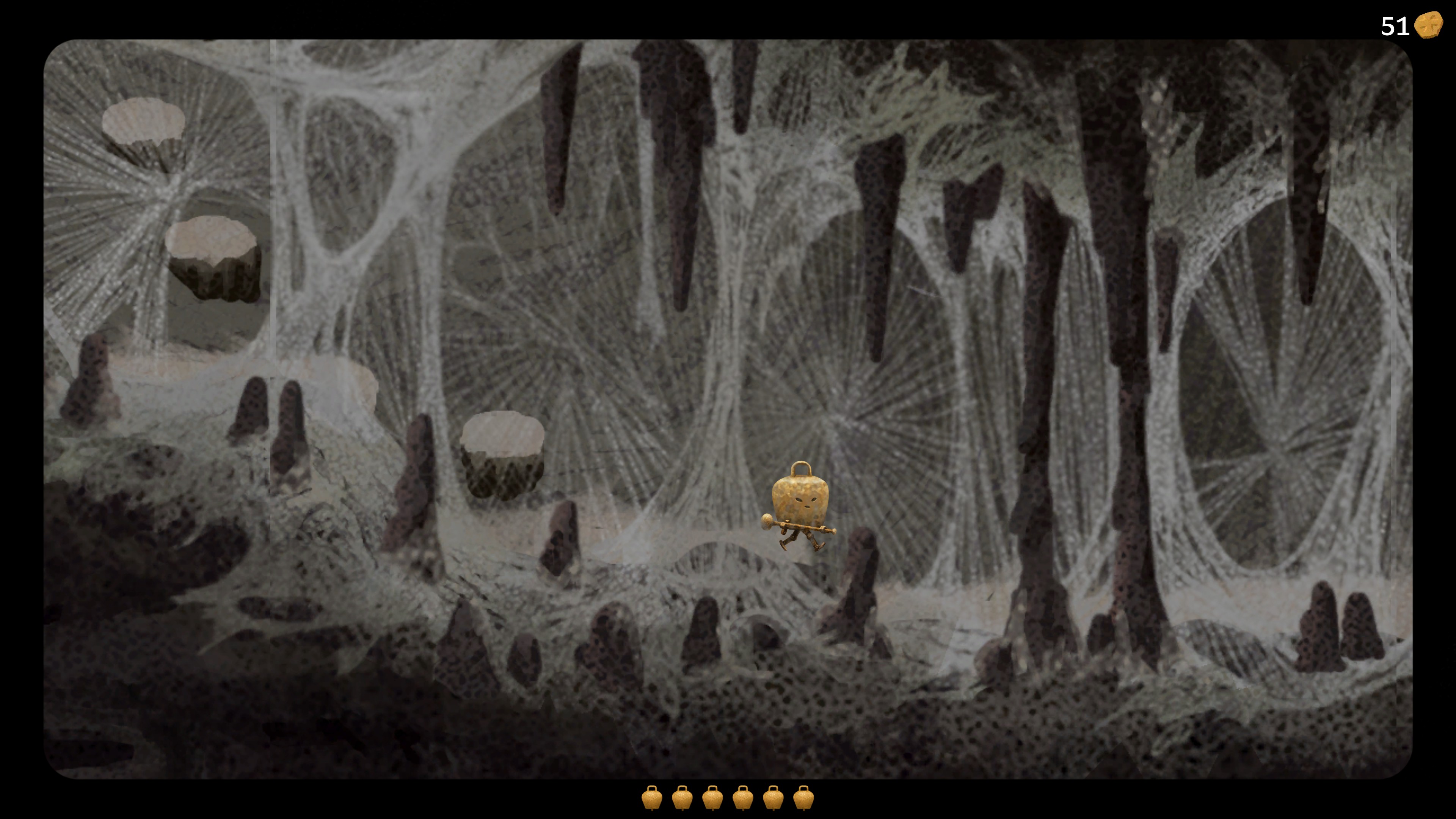 I really enjoyed exploring all the different areas. By exploring, the player can find currency for upgrades or additional health tokens between checkpoints. Checkpoints are represented by small glass bottles of fireflies, returning to one will refill all of the character’s health tokens. Every time the character is hit, they will lose one health token and a coin, if they have one. Coins can be picked up unless they fall into inaccessible or dangerous spaces, such as spike pits. Players can also become trapped in spike pits, repeatedly taking damage and losing coins that are unrecoverable until they die.