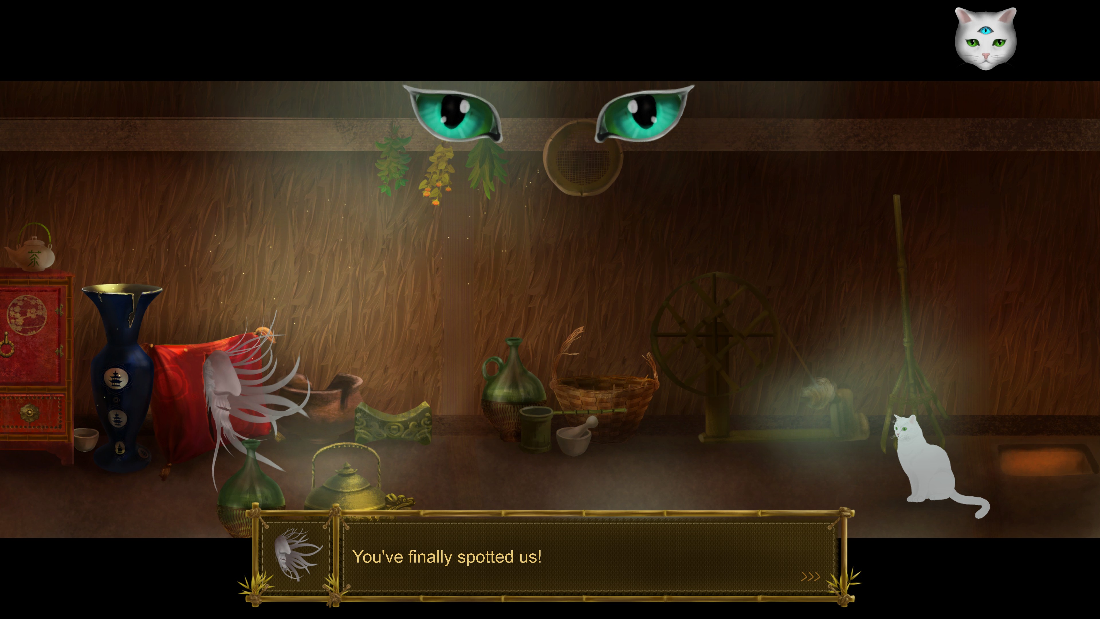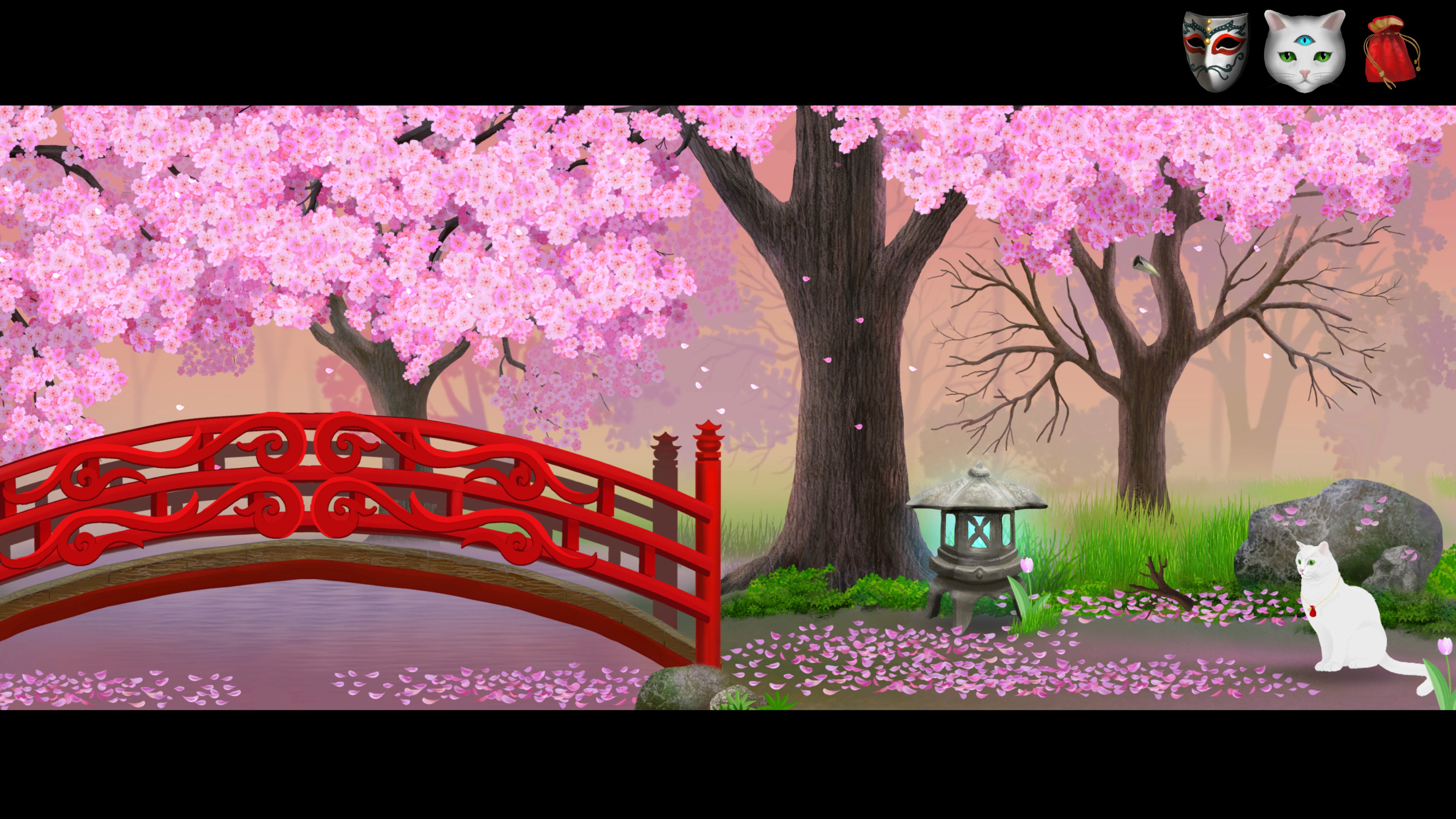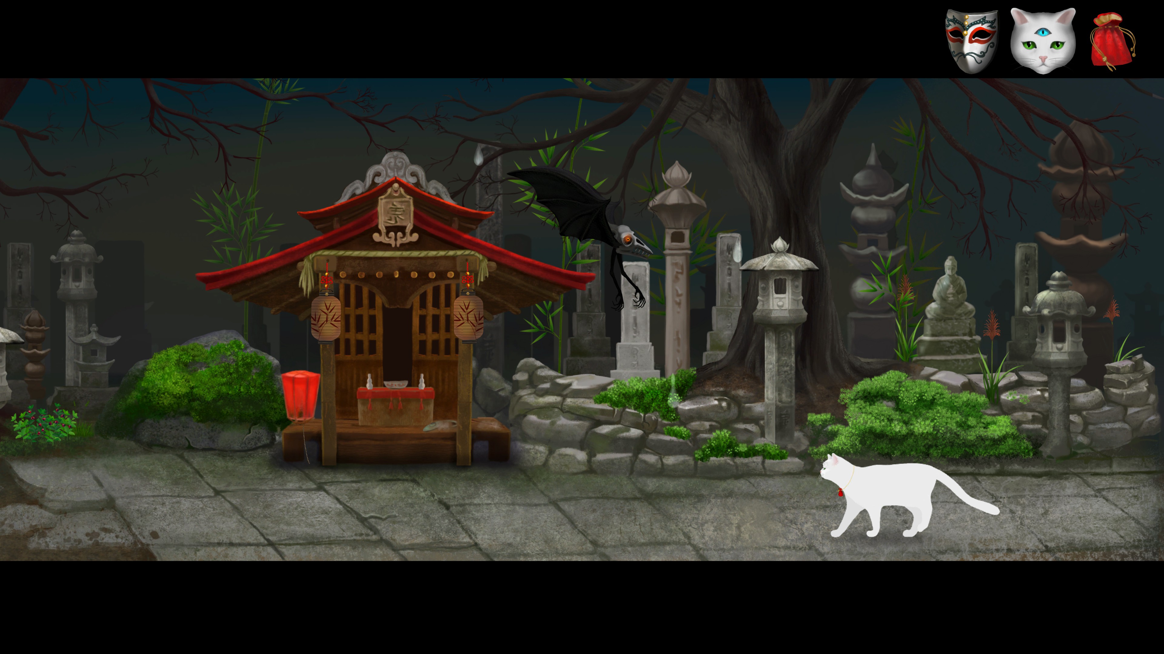 Cat and Ghostly Road is an adventure game following a cat looking to return his master soul. After a demon steals the spirit of a man who saved the cat’s life, the cat goes on an adventure through the spirit world to defeat the demon and recover the man’s soul. Players use the cat’s third eye ability to be able to see spirits in order to work with them or gain advice. Later on, the player also gains the ability to change into a human form, such that they can interact with larger objects and things otherwise above their head.