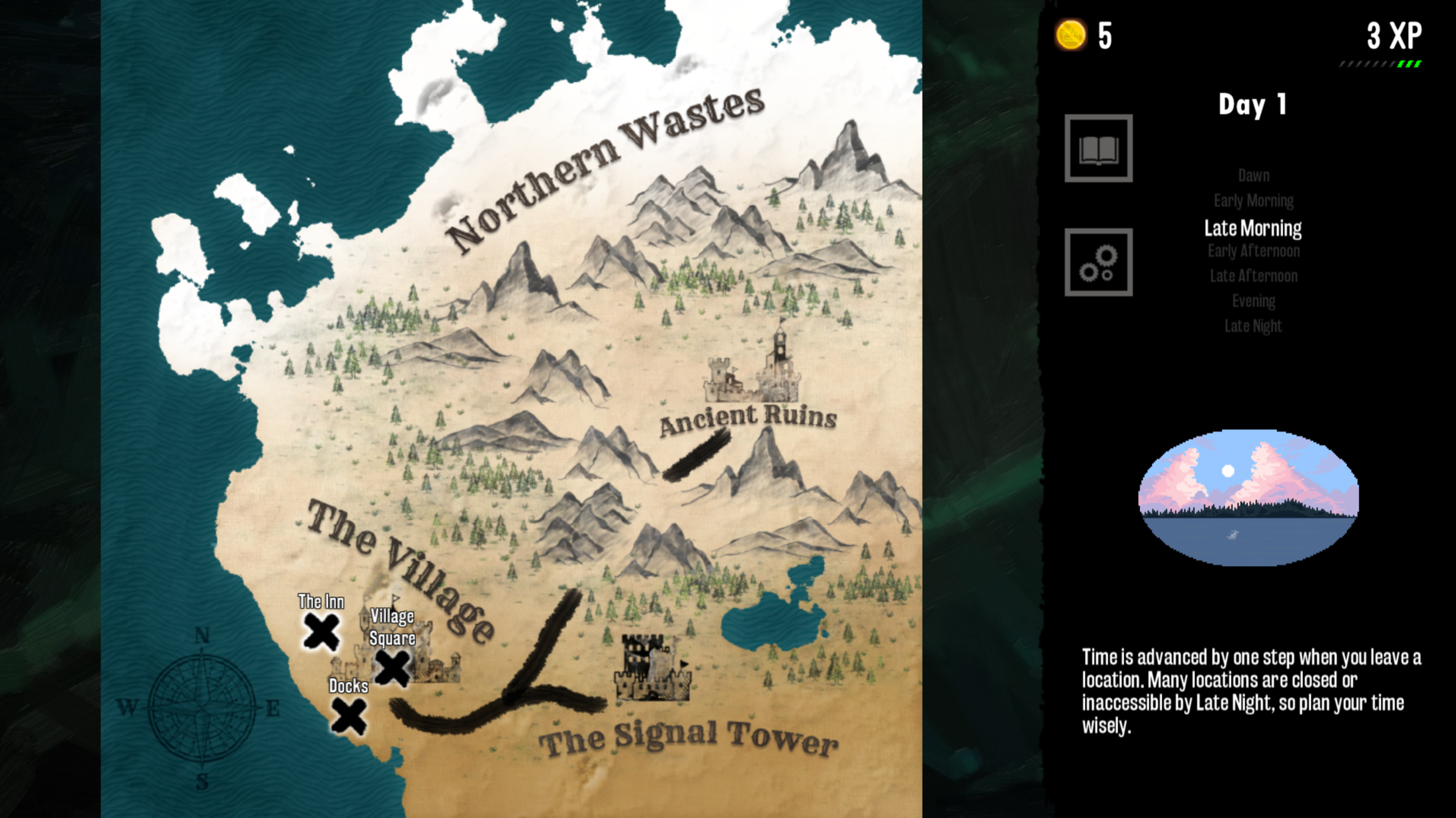 As the player gathers information about the murder, they must travel to and unlock a number of locations around the village and surrounding area. Each travel takes one time unit (there are 7 per day) and many locations are different or not accessible at certain times. Traveling outside the village risks encounters with enemies such as bandits, wolves, and worse, particularly at night.