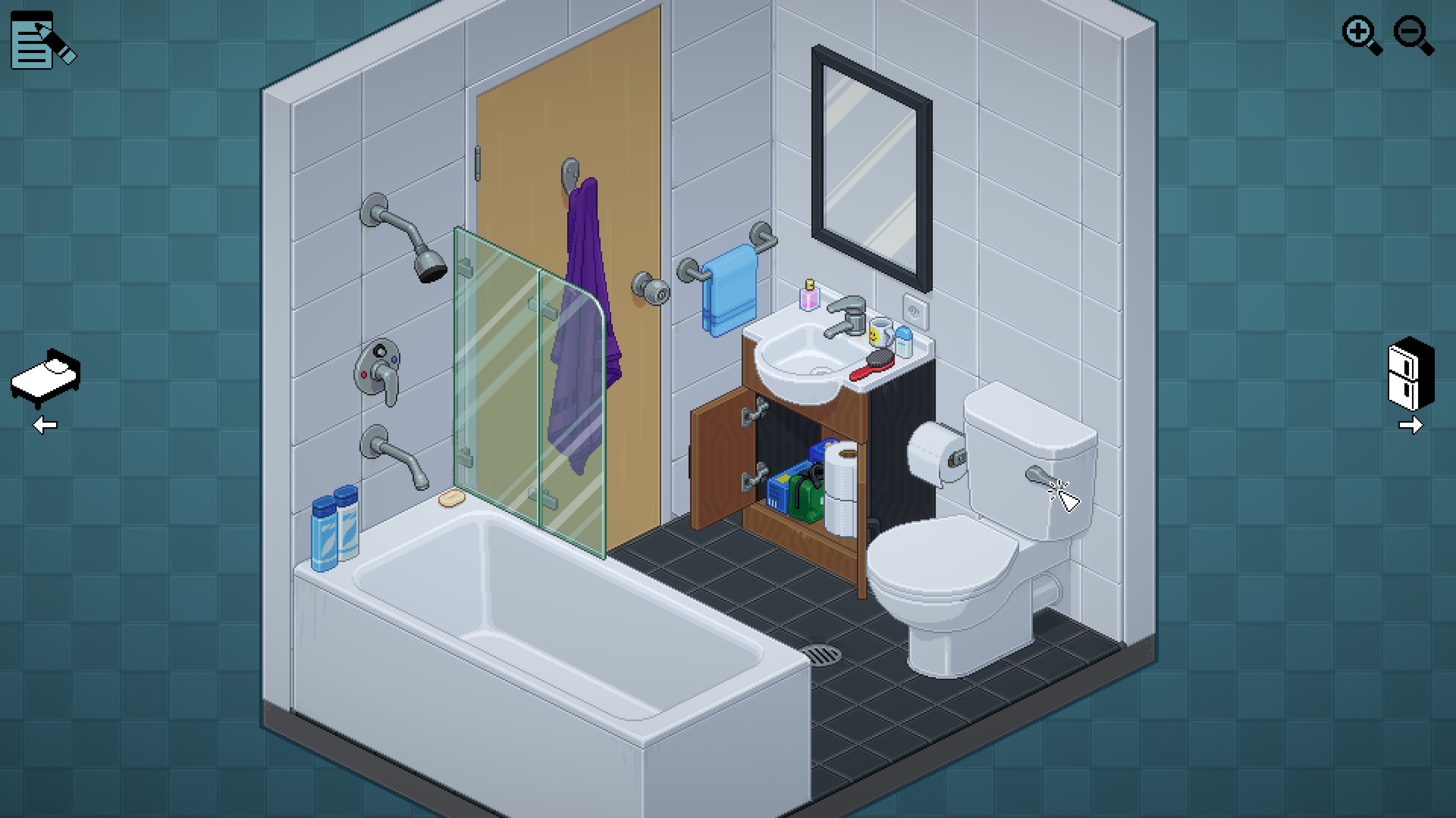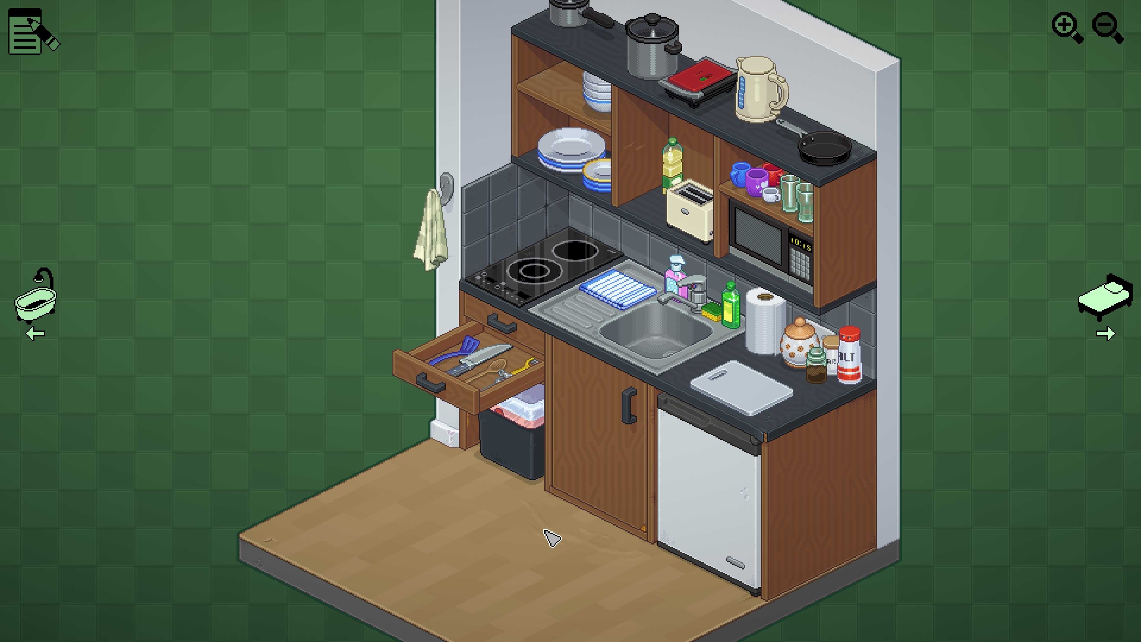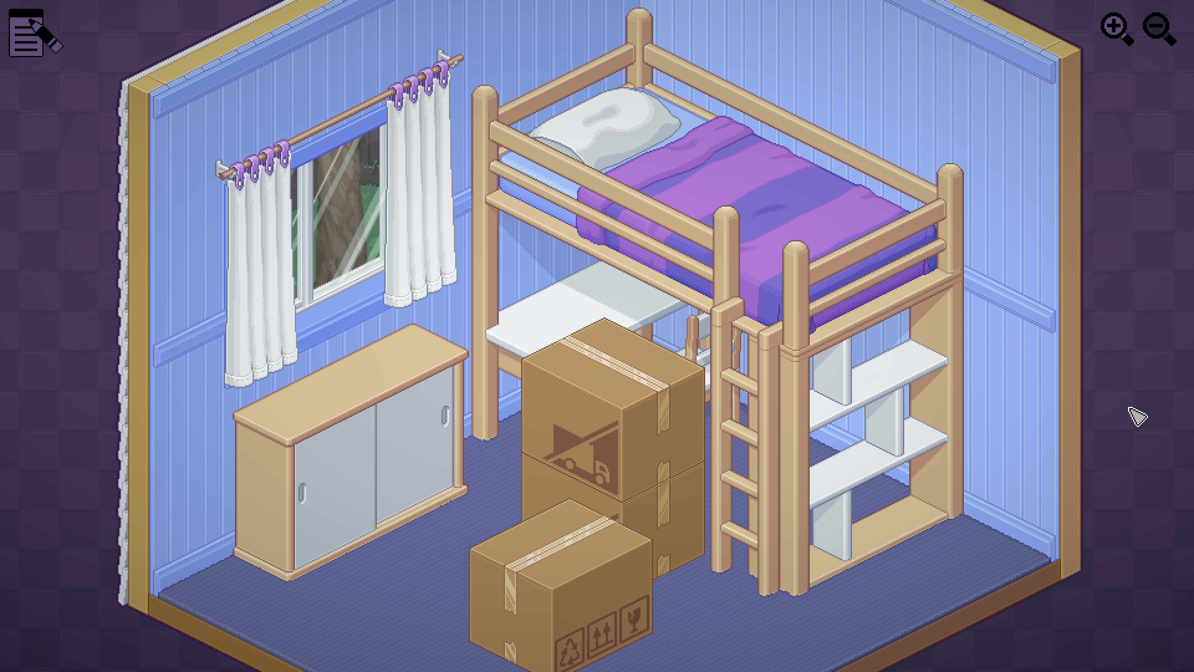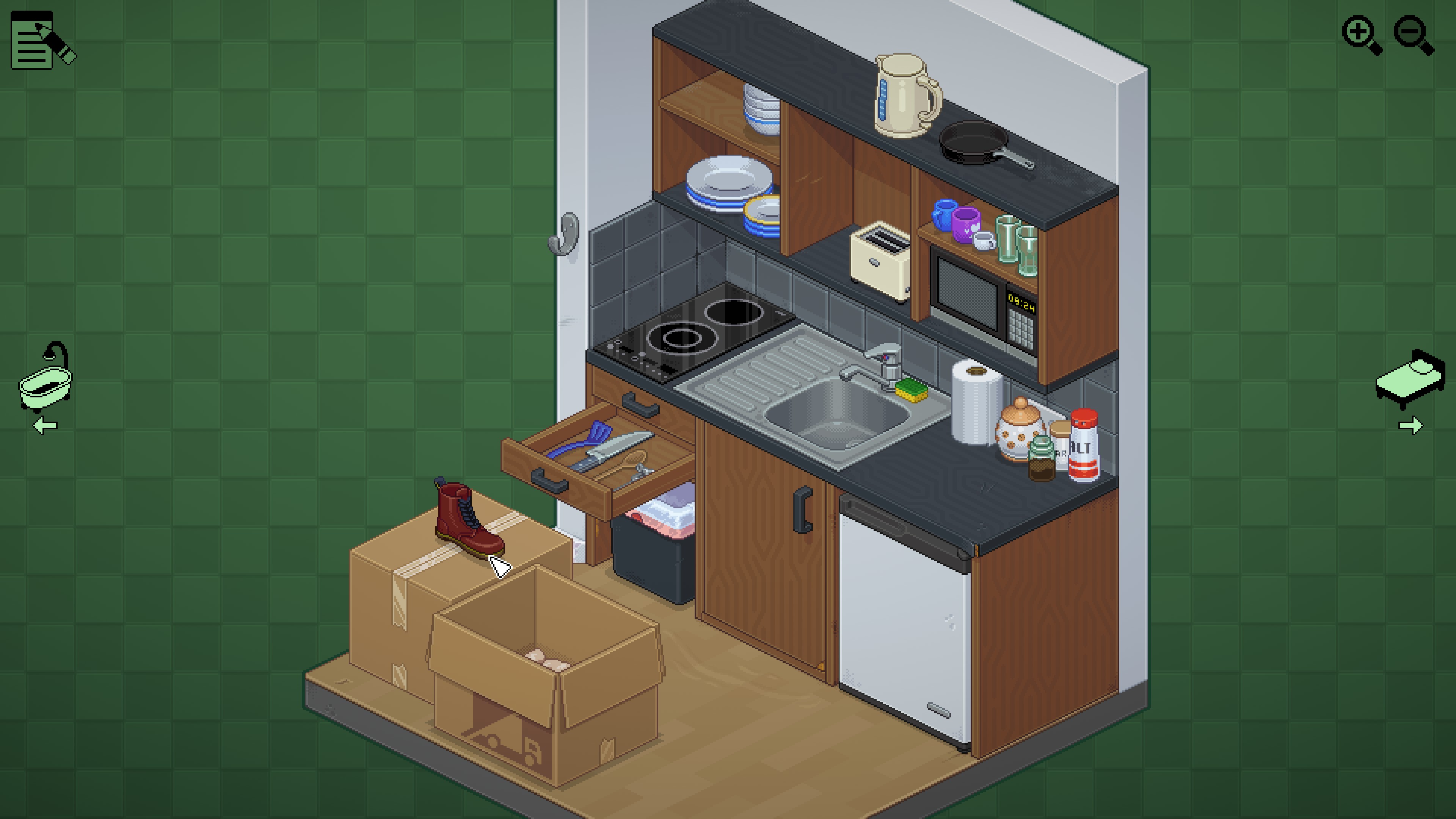 The Unpacking demo covers the first two moves of the unnamed female character. The first appears to be moving into a new childhood room, around the age of a preteen. The second move looks like a tiny single bedroom apartment, perhaps during college / university. The final game aims to have eight moves total. As the moves get bigger, players can switch back-and-forth between rooms with arrows on the sides of the screen.