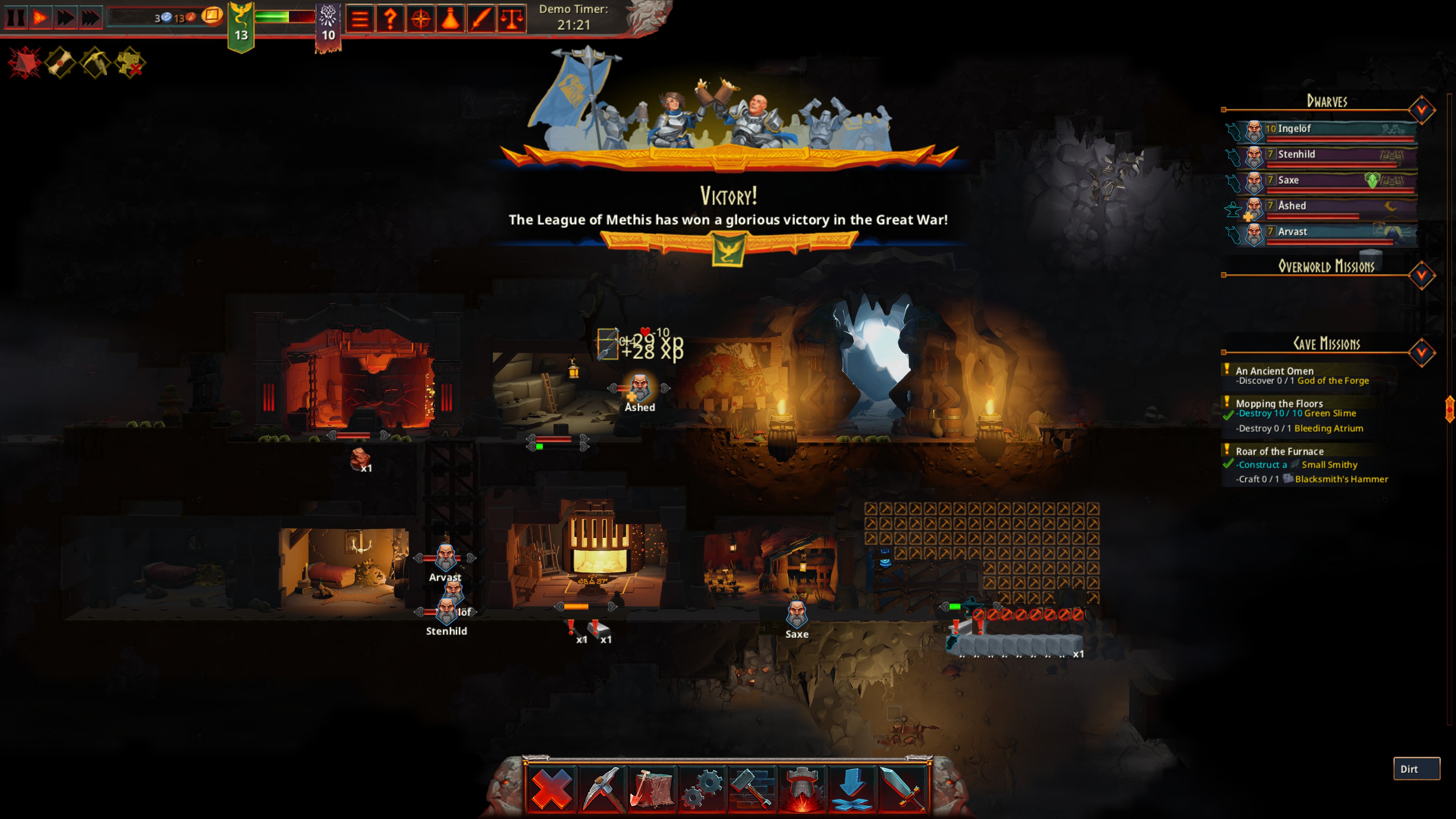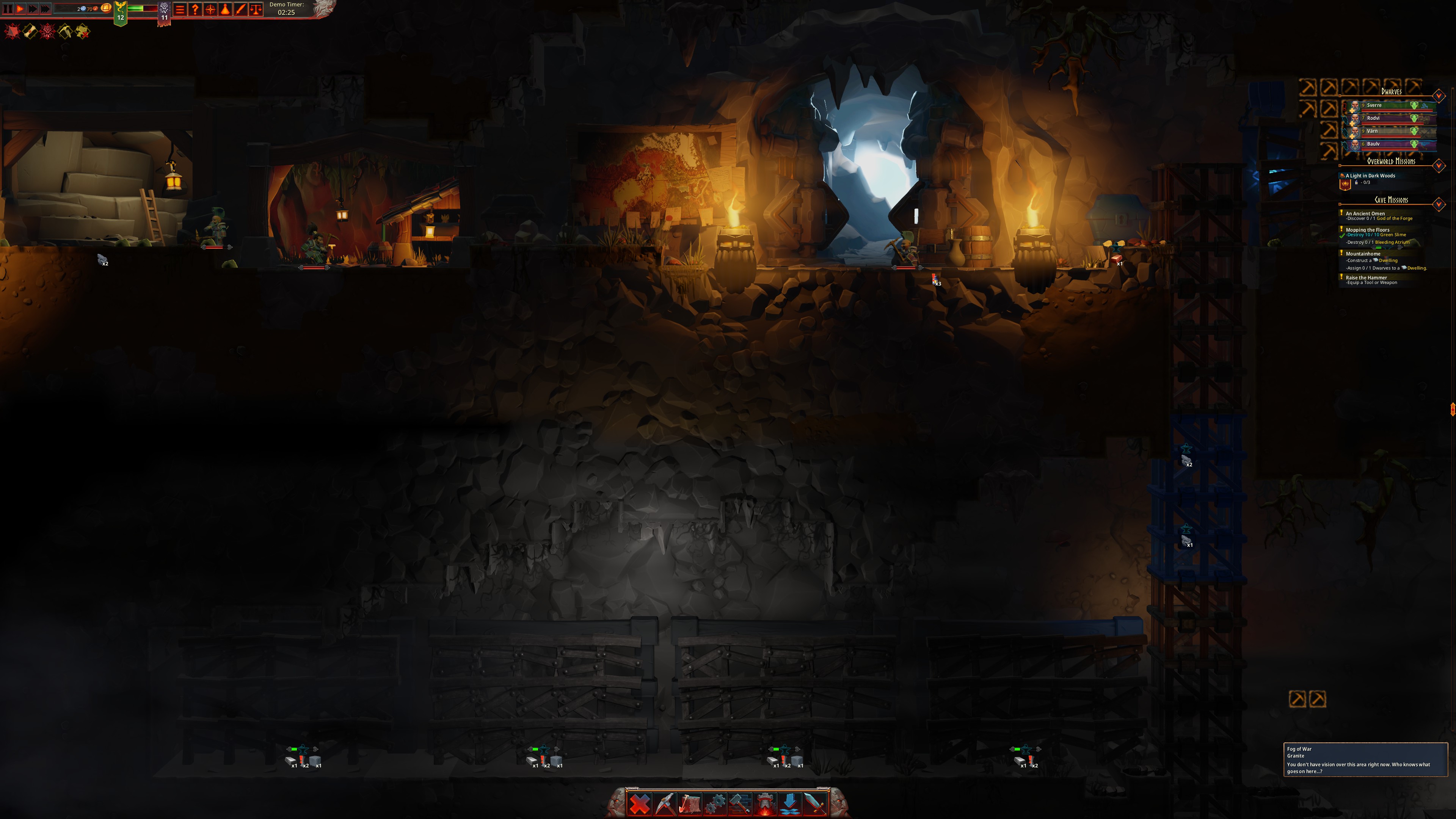 Players in the demo will start out with a colony entrance into a cave in their Moutainhome and small storage chest. They can command their dwarves to move deeper into the cave, finding new resources, enemies, and gathering ‘mountain lore’. Mountain lore is one of the resources used for research. Once players have fully explored their start cave, they can command their dwarves to mine to find new caves and resources, or to make room for structures.
