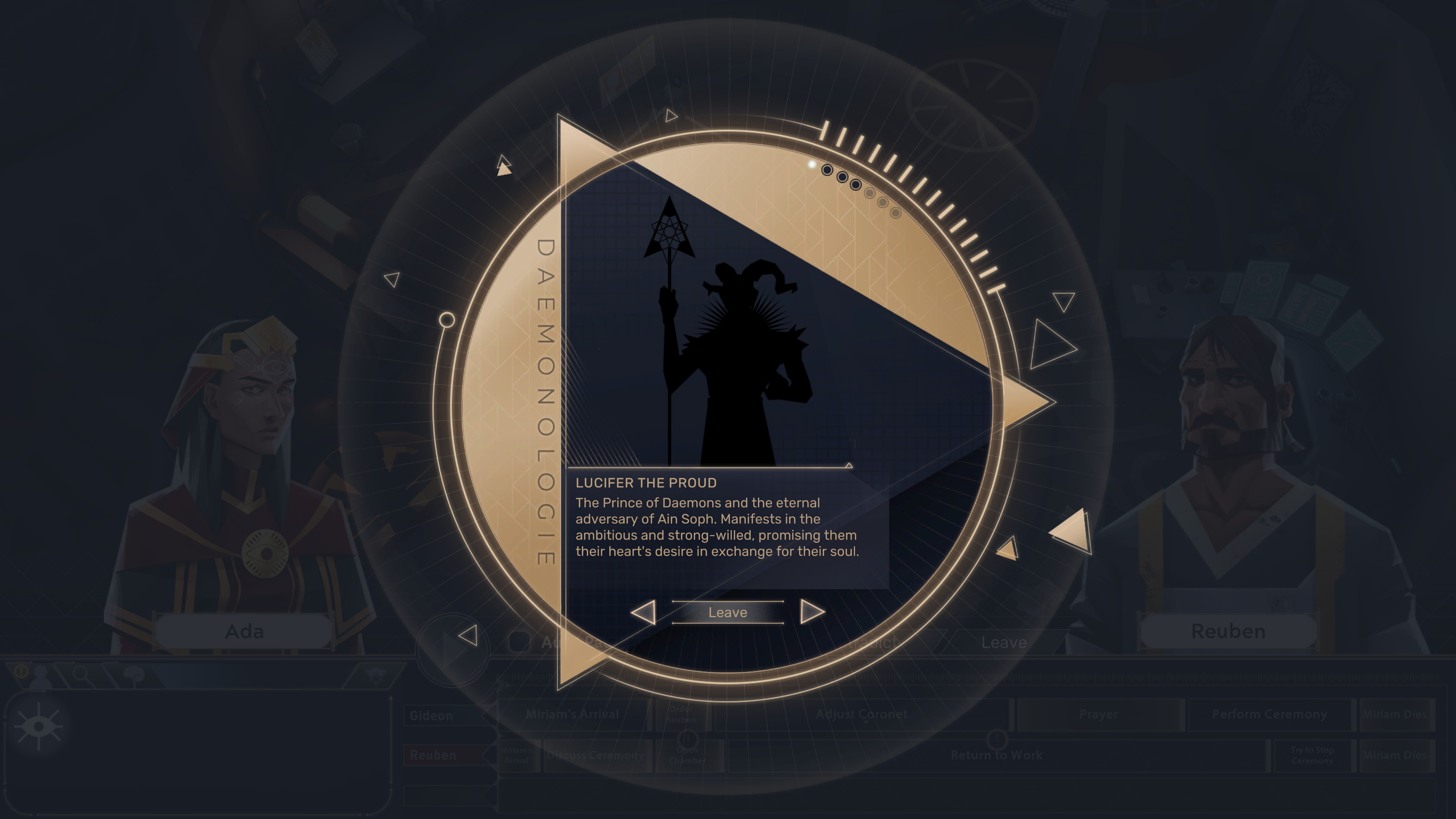 In the demo for Lucifer Within Us, players are brought to the scene of a suspected murder. Two suspects are present who can be questioned, providing a timeline of events according to them. While listening to their testimony, players see events replay from their point of view, including their limited cone of vision and any actions that may later be recanted or proven false.