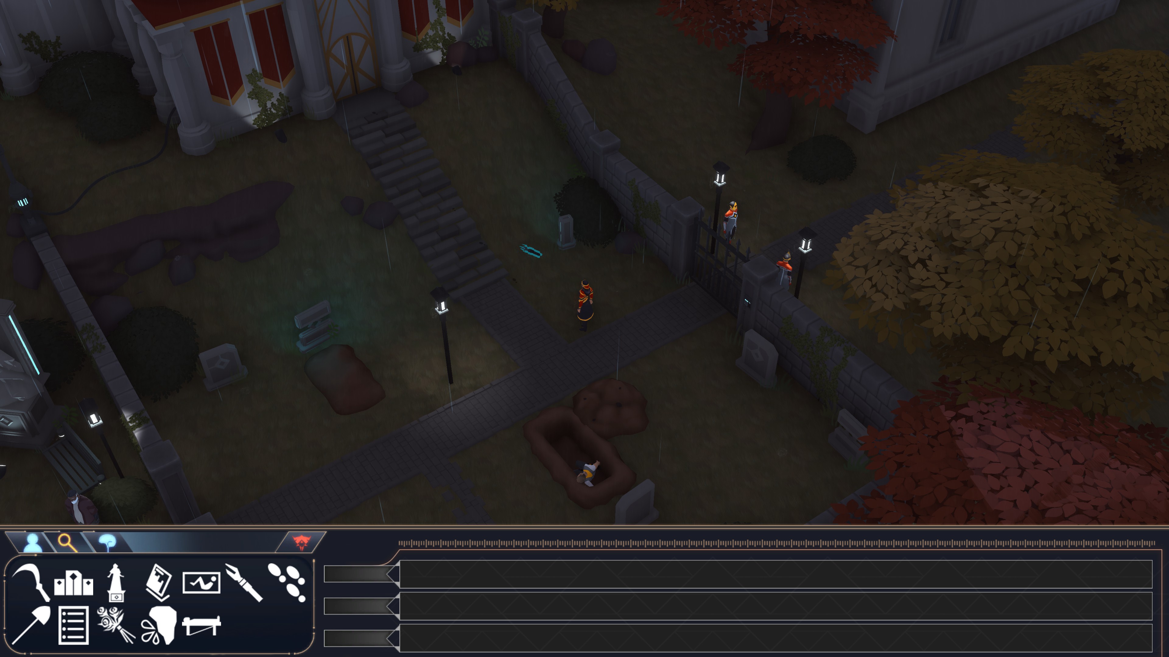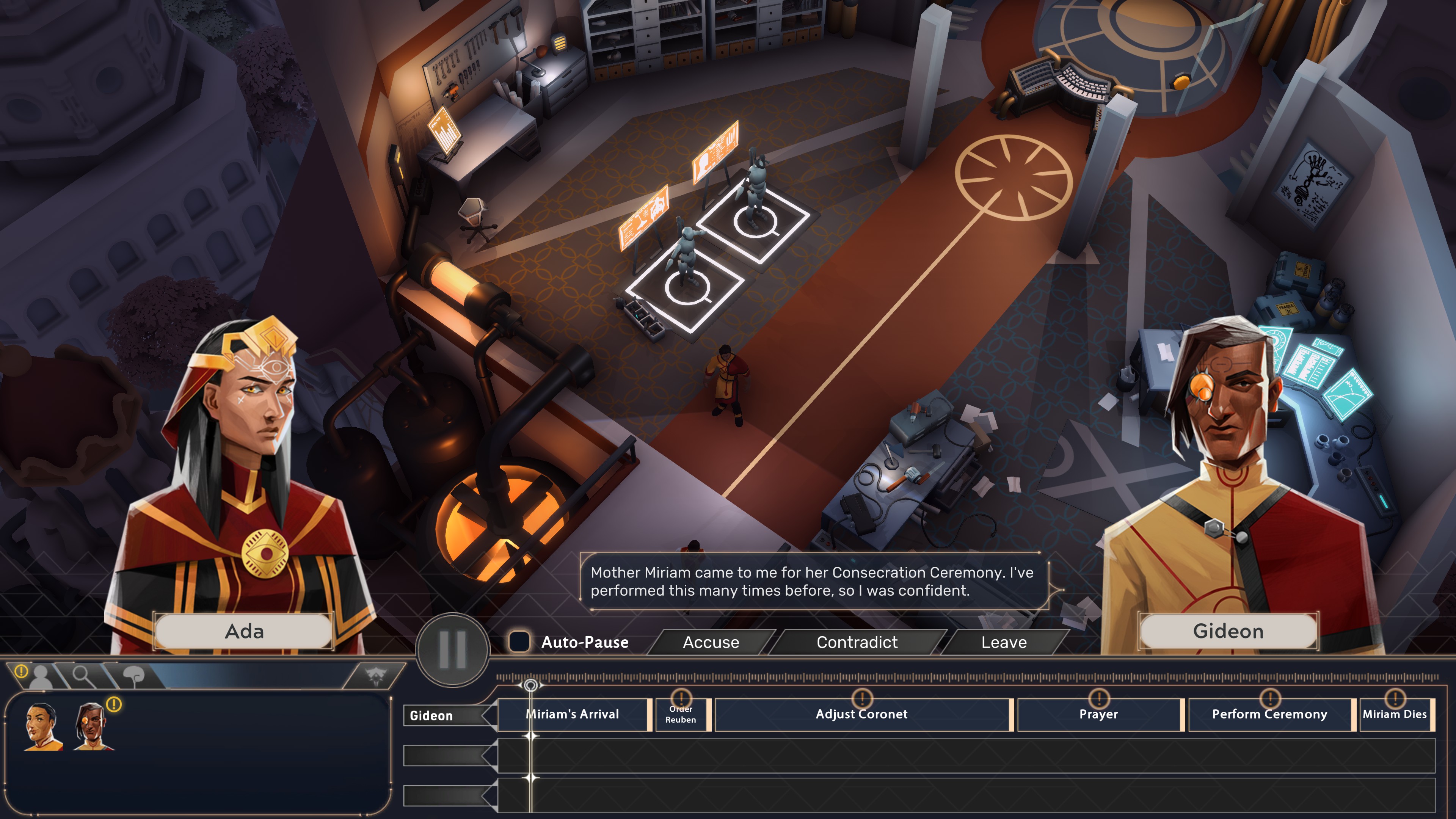 Once players have the testimonies from suspects, they can question them for further detail on any section or replay from any point in the timeline. Suspects can be questioned about each others’ timelines and notes on the different events will keep track of what actions have been corroborated and which have not. Statements can also be corroborated by physical evidence or contradicted.