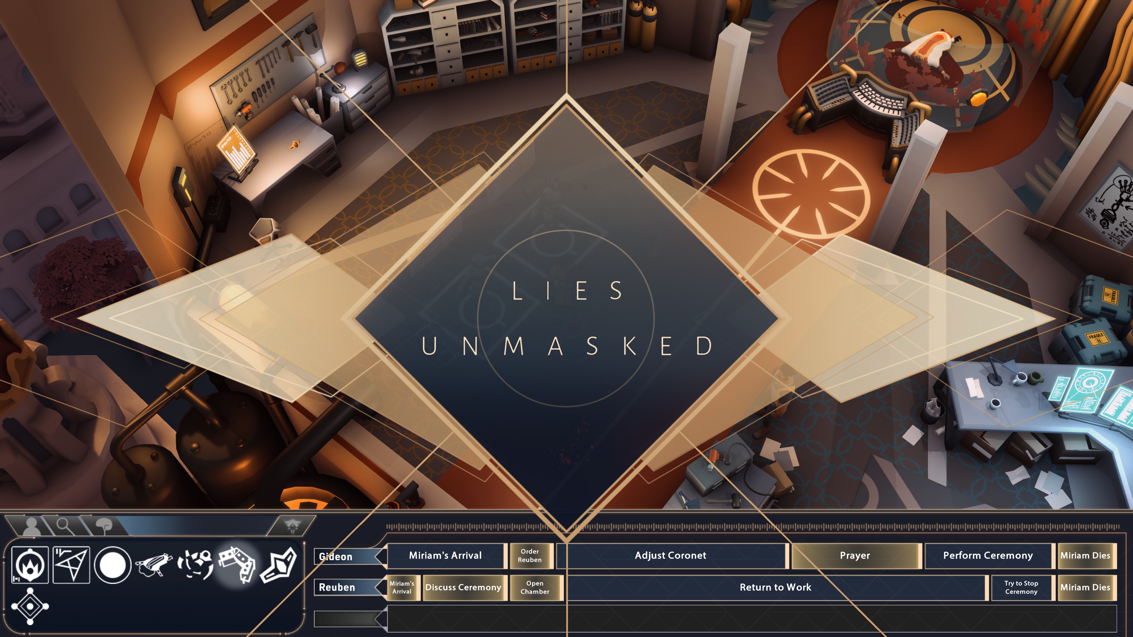In Lucifer Within Us, players are brought to the scene of a suspected murder. Suspects are present who can be questioned, providing a timeline of events according to them. While listening to their testimony, players see events replay from their point of view, including their limited cone of vision and any actions that may later be recanted or proven false.