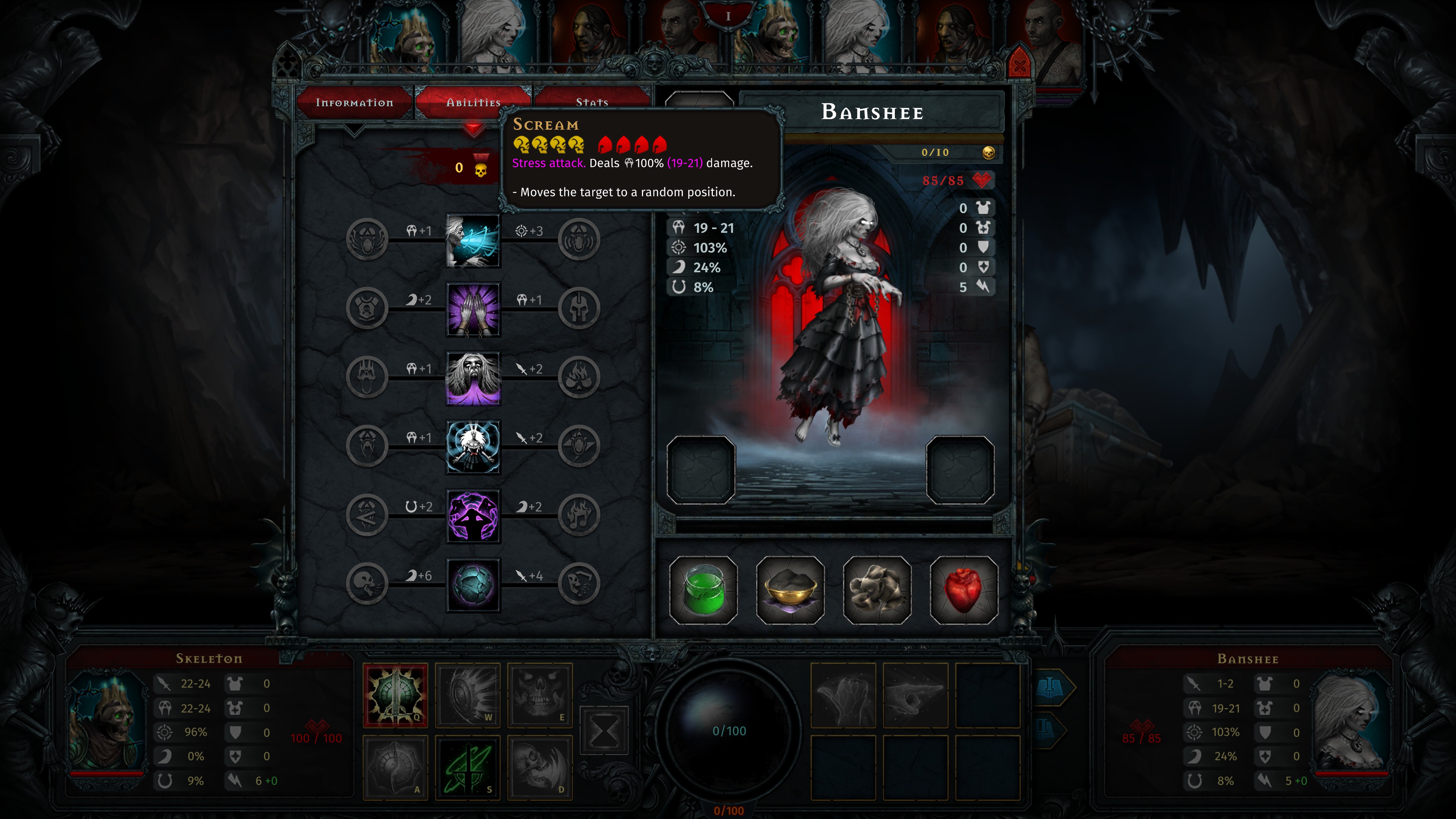 All minions are capable of dealing at least two types of damage to enemies. Damage is either physical, magical, or stress. Iratus’ own minions (and some enemies) are immune to stress damage and thus don’t have a sanity bar. Lowering an enemy’s sanity often gives permanent debuffs, and in some cases can cause the enemy to flee or instantly die. Physical and magic damage are dealt to regular health, although magic damage uses defenses more akin to stress damage. Stats do not automatically increase as minions or Iratus level up, but skill and stat points are allocated per minion level and different minions have different costs for leveling up each stat.