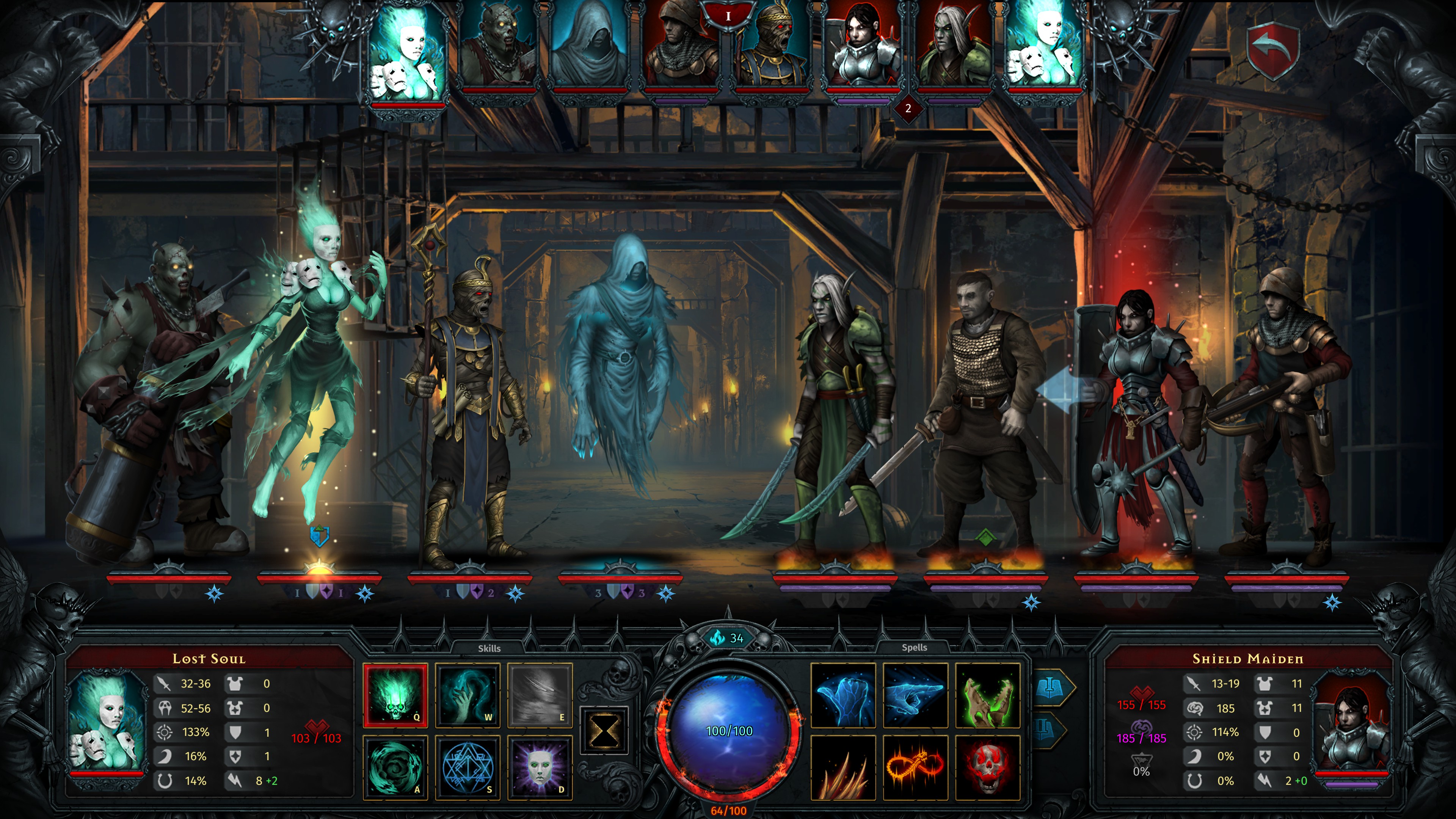 Iratus: Lord of the Dead is a party-building roguelike. Players craft a variety of undead minions to combine into parties of up to four. Minions can freely be swapped between parties, which becomes more important as players learn about the enemy’s strengths and weaknesses. Minions have a number of stats from health and defenses to hit and crit chance. Some minions are also able to gain specialized shields that completely nullify either a physical or magic attack.