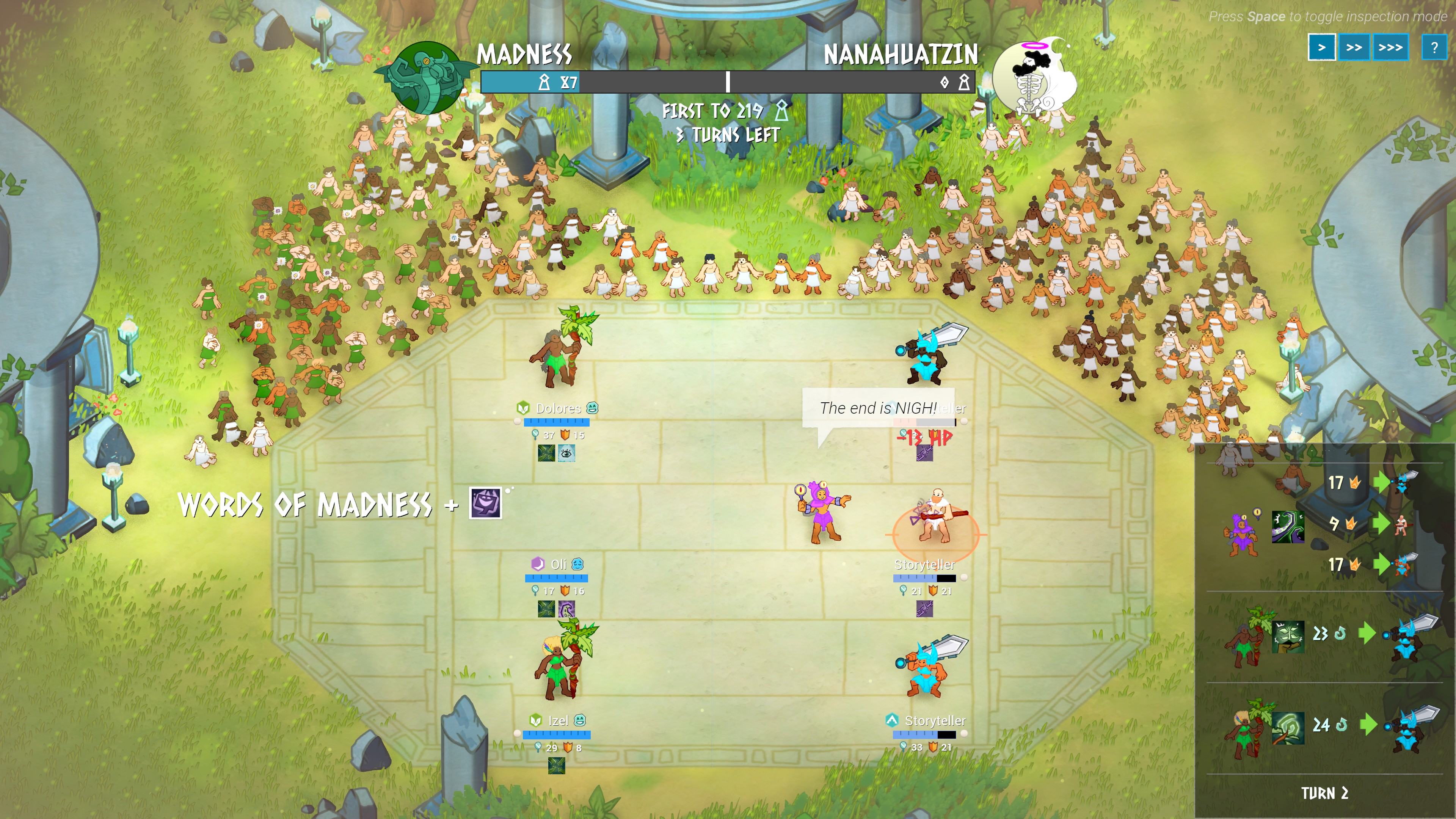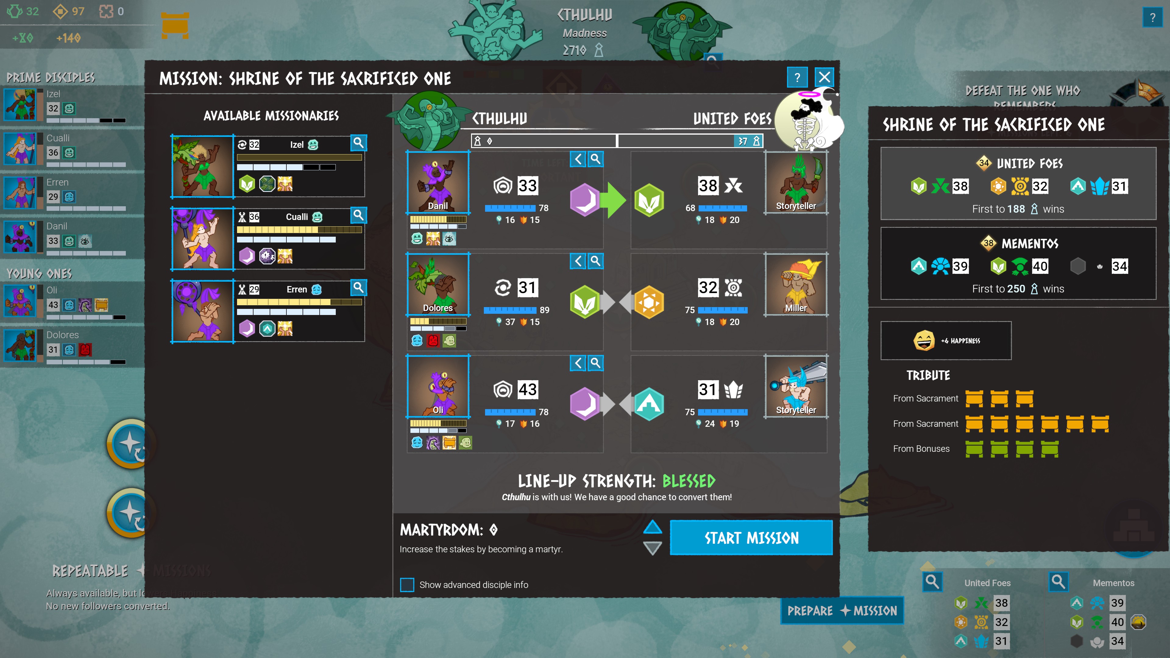 Combat is done 3 vs. 3 to a maximum of 4 turns. There are two possible win conditions, convert the crowd to the player’s side (favored by moral abilities) or defeat all opponents (favored by physical abilities). Disciples typically enter combat with 5 abilities in their “mind”. Each turn they will randomly use one of these abilities, typically targeting the opponent opposite them but increasingly targeting the weakest opponent as they grow stronger. The opponents will do the same, and strong defensive units on either side may also intervene to protect the targetted ally. Opponents’ stats, passives, and abilities are fully visible before combat.