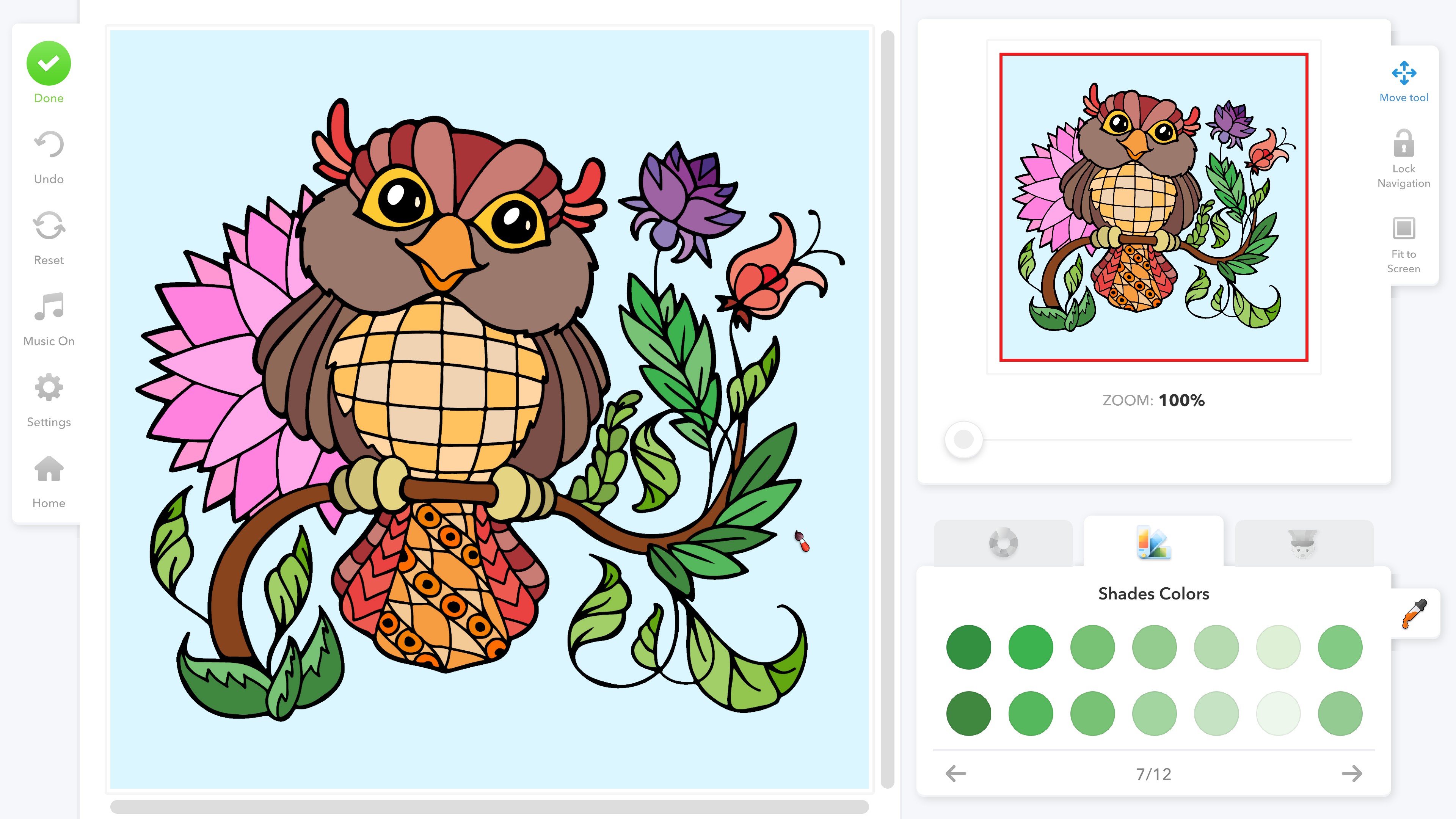 Coloring Book for Adults is a free-to-try digital coloring book. By default, players start with three books unlocked for a total of 85 free images to color. These are Mandala, Owls, and Dinosaurs. Other books can be unlocked individually or everything can be unlocked for one flat cost. Players can export their work in several file formats, and revisit their work in their gallery to make edits or start over at any time.