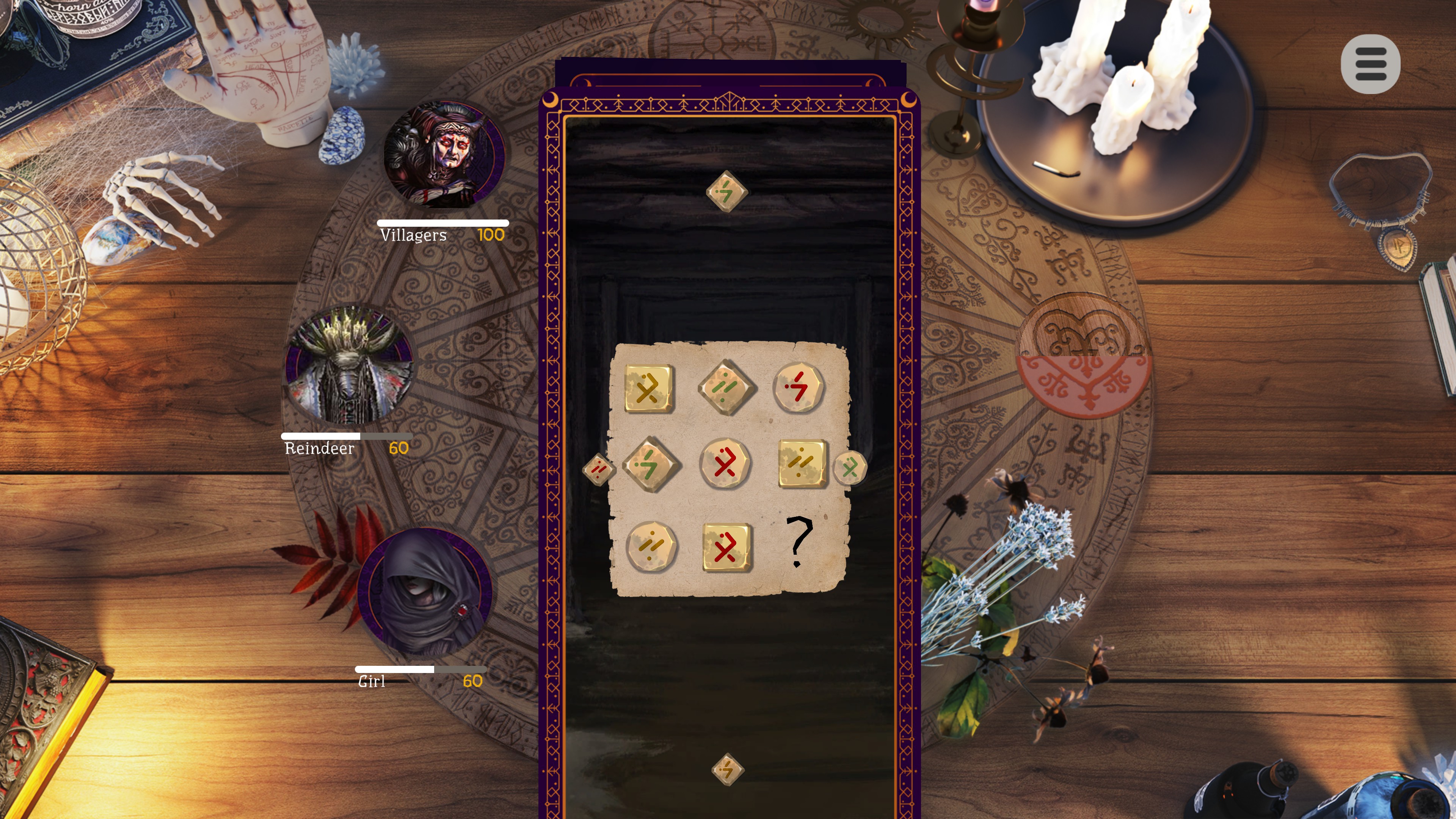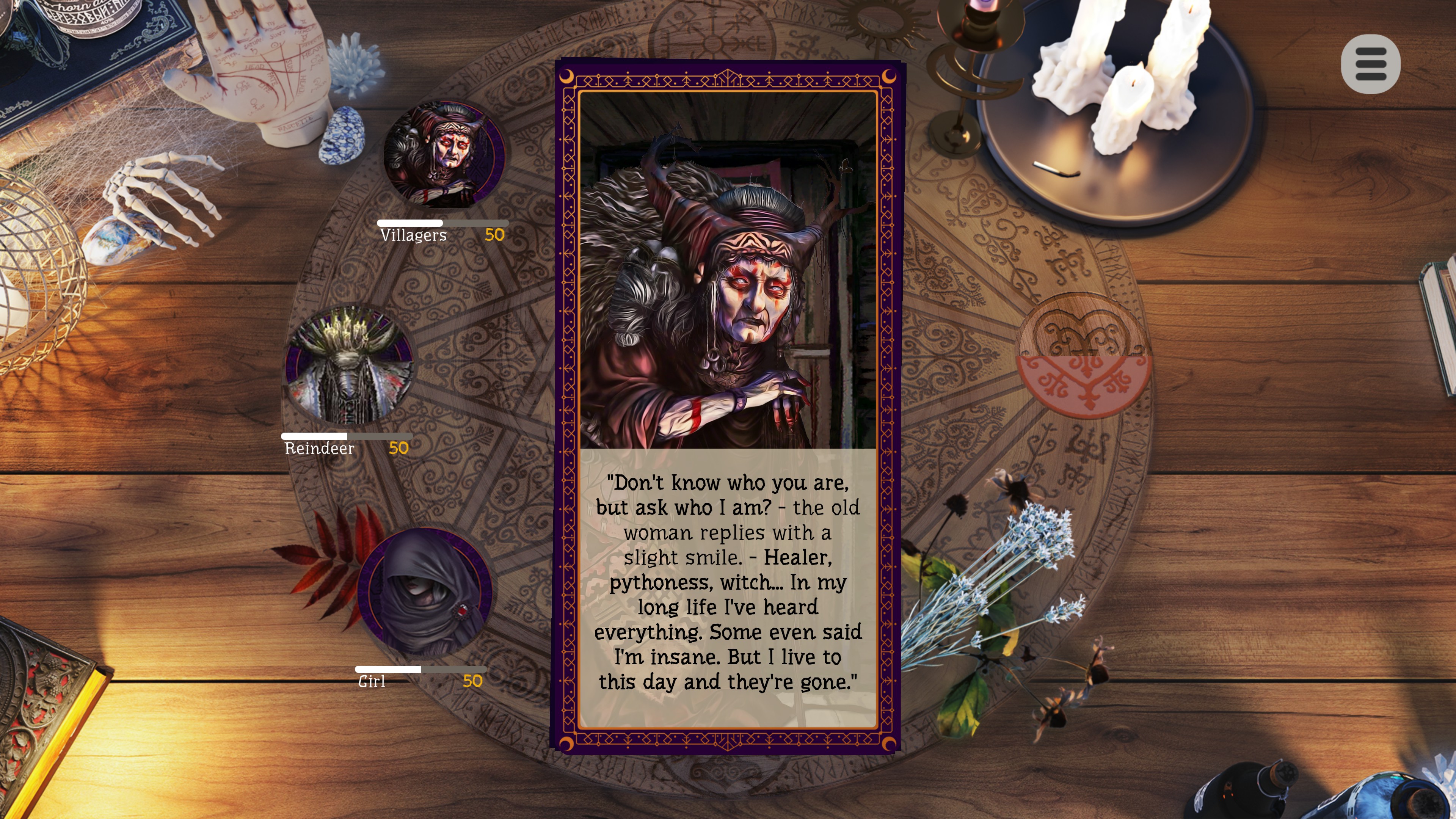 Unforgotten is a choose-your-own-adventure game where players take on the role of Oleg, who gets lost in the woods and stumbles across a strange shaman town. The story is told from a deck of cards and players flick the cards in different directions to make choices (both mouse and keyboard work). Throughout the story, players will gain items and increase or decrease relations which are displayed to either side of the card deck. Some items may be used by selecting them from the display on the right.