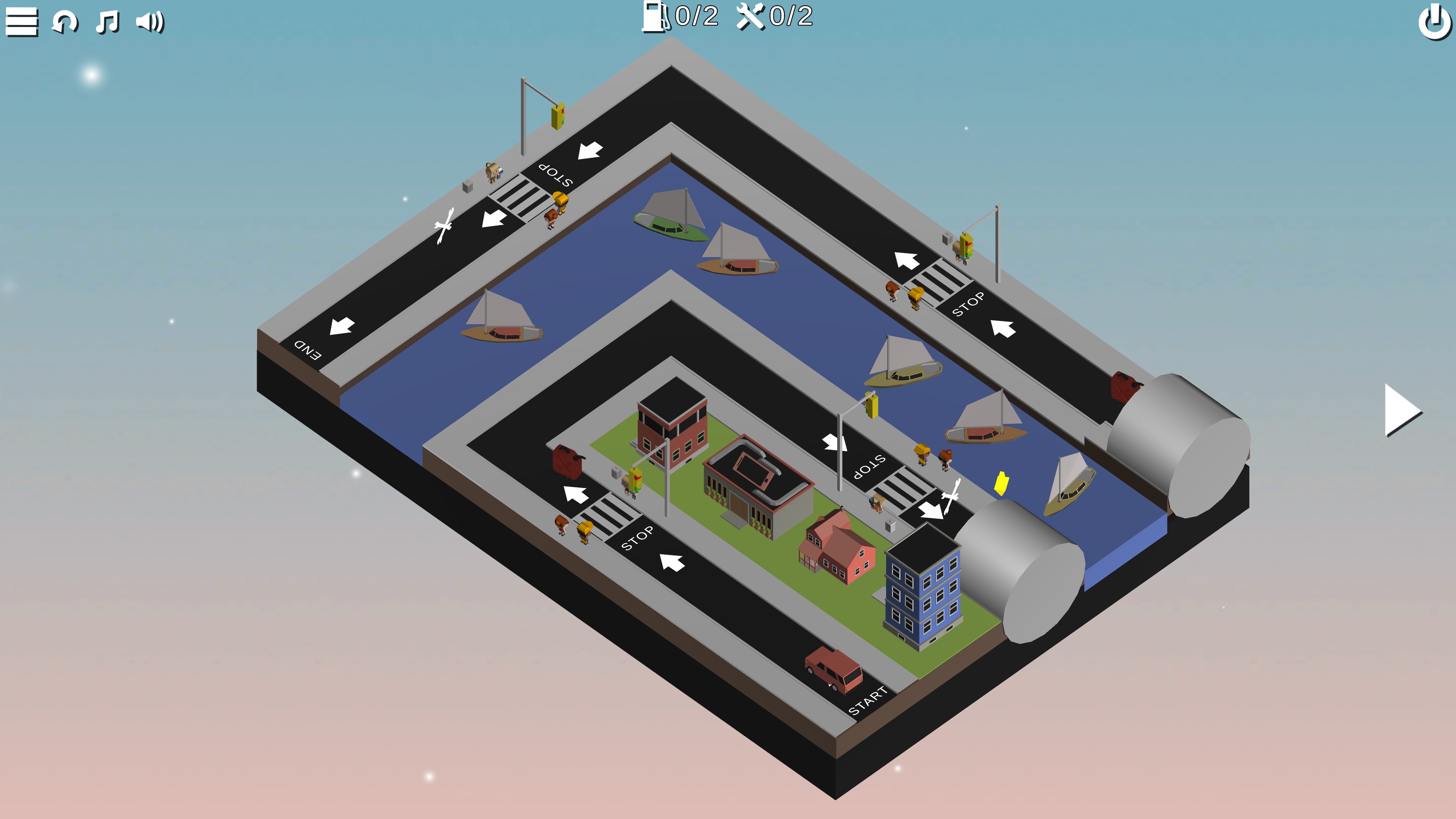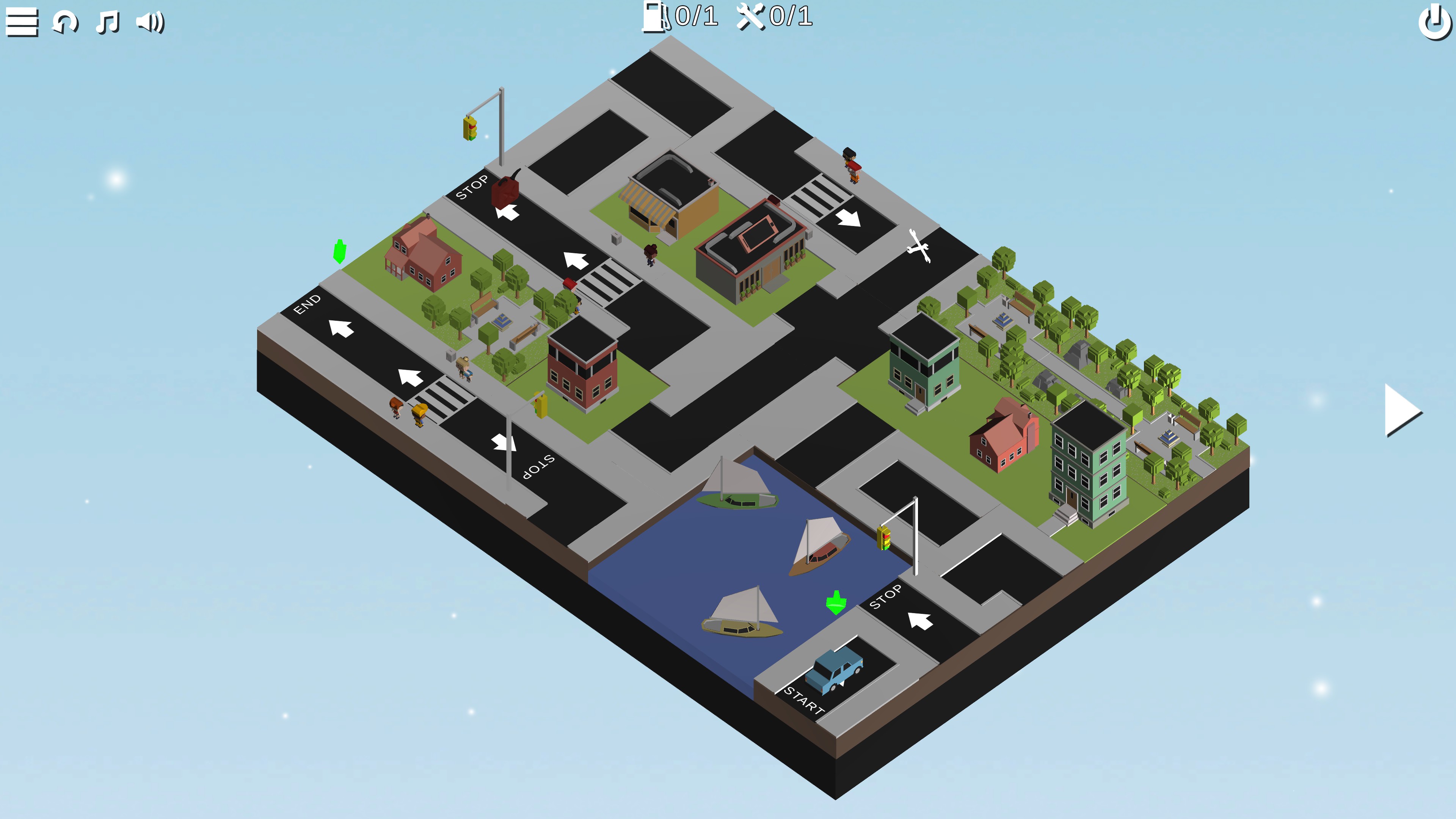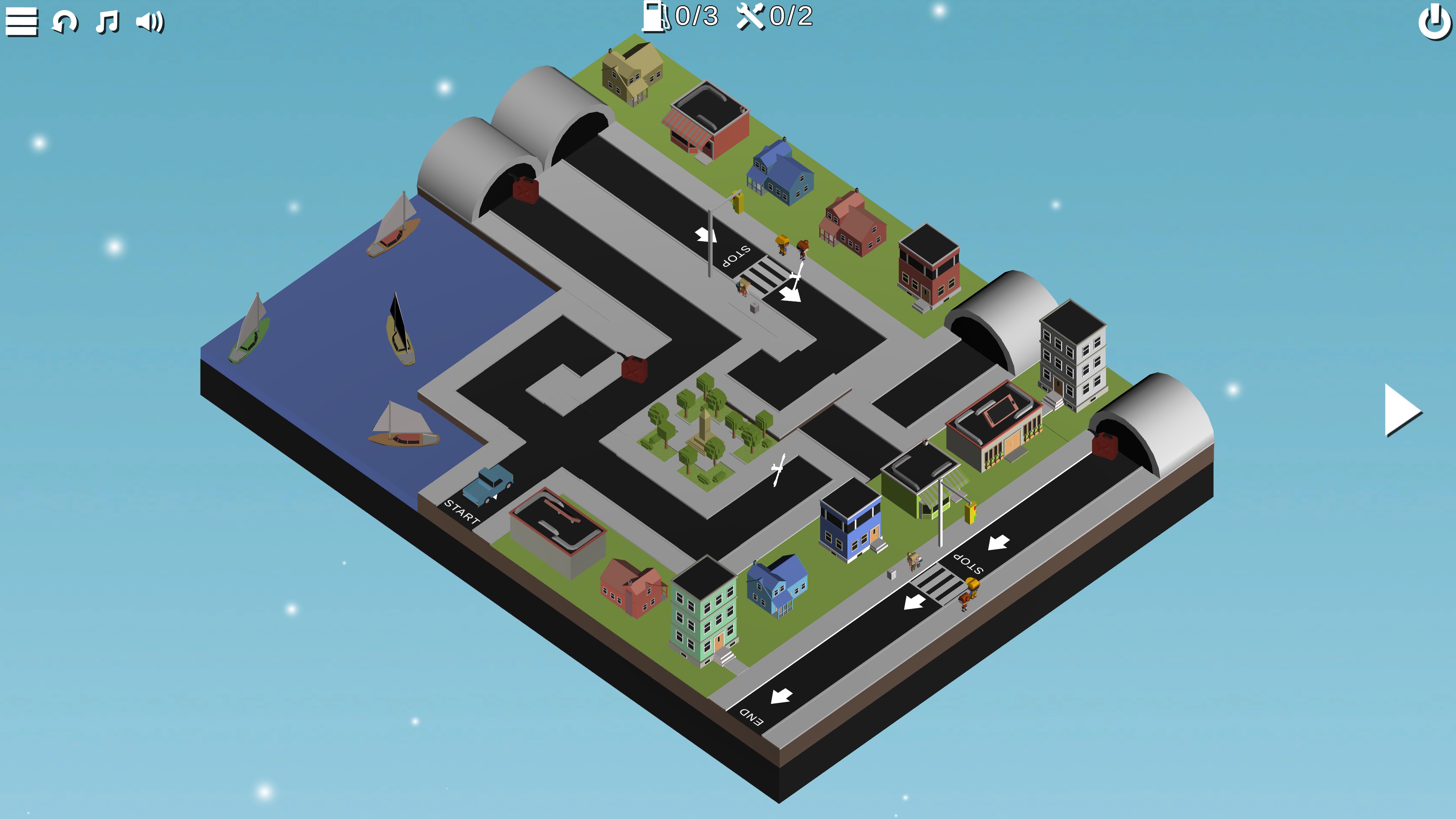 Puzzle Car is a simple tile arranging puzzle game. Players are tasked with moving tiles of the road to create a single complete path for the car to travel from the start to the end. Along the way, the car will automatically obey all turns and pass straight through intersections, but players will have to place stoplights to ensure it stops at crosswalks. Later on, there are also tunnels players will have to use to essentially “teleport” the car around. For perfect routing, the car must pass over every tile of the road and collect all the gasoline and mechanic tools.