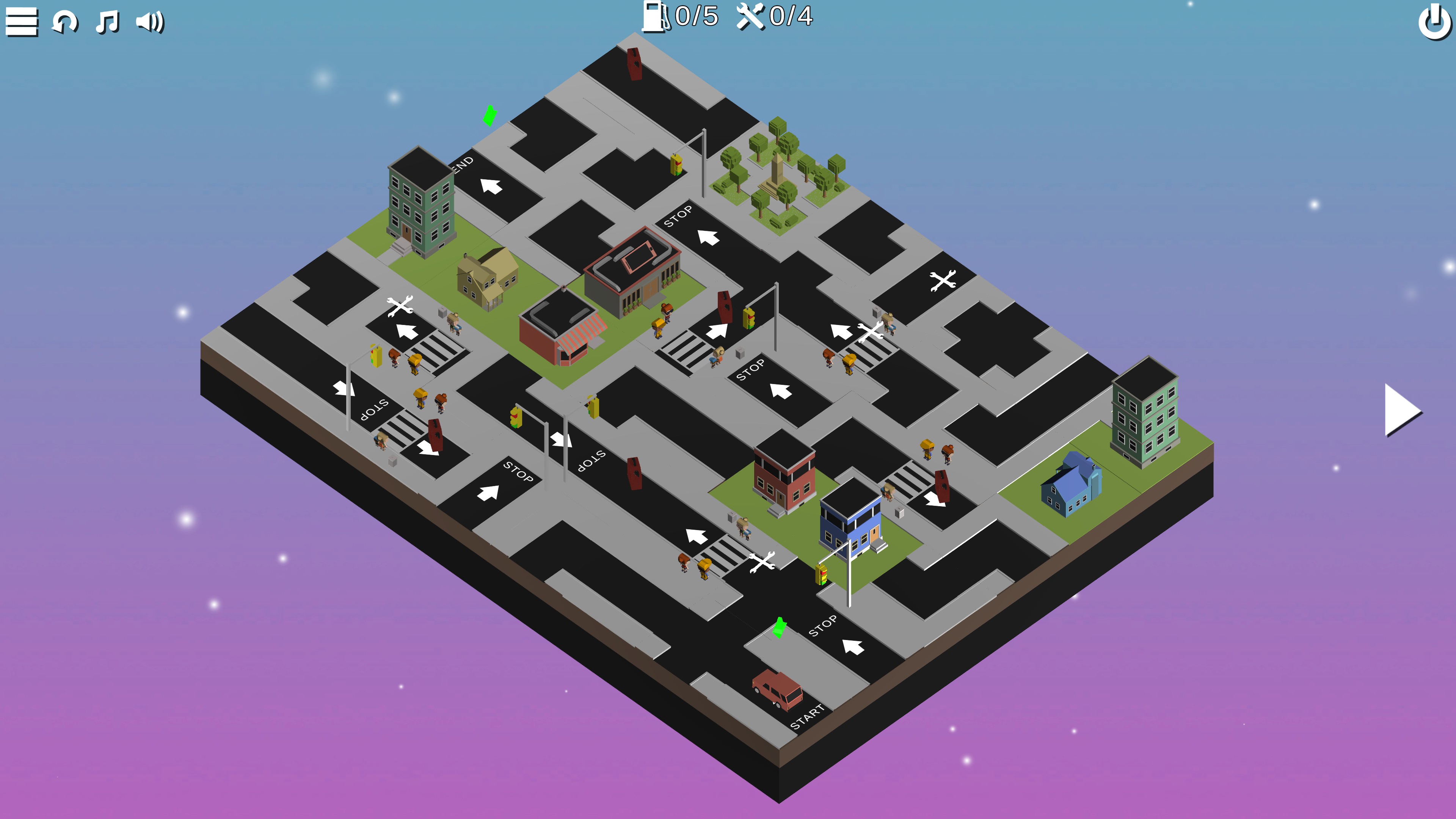 Later levels can look daunting, but using stoplight + crosswalk combinations can tell the player where straight sections are and which way the car should drive on them