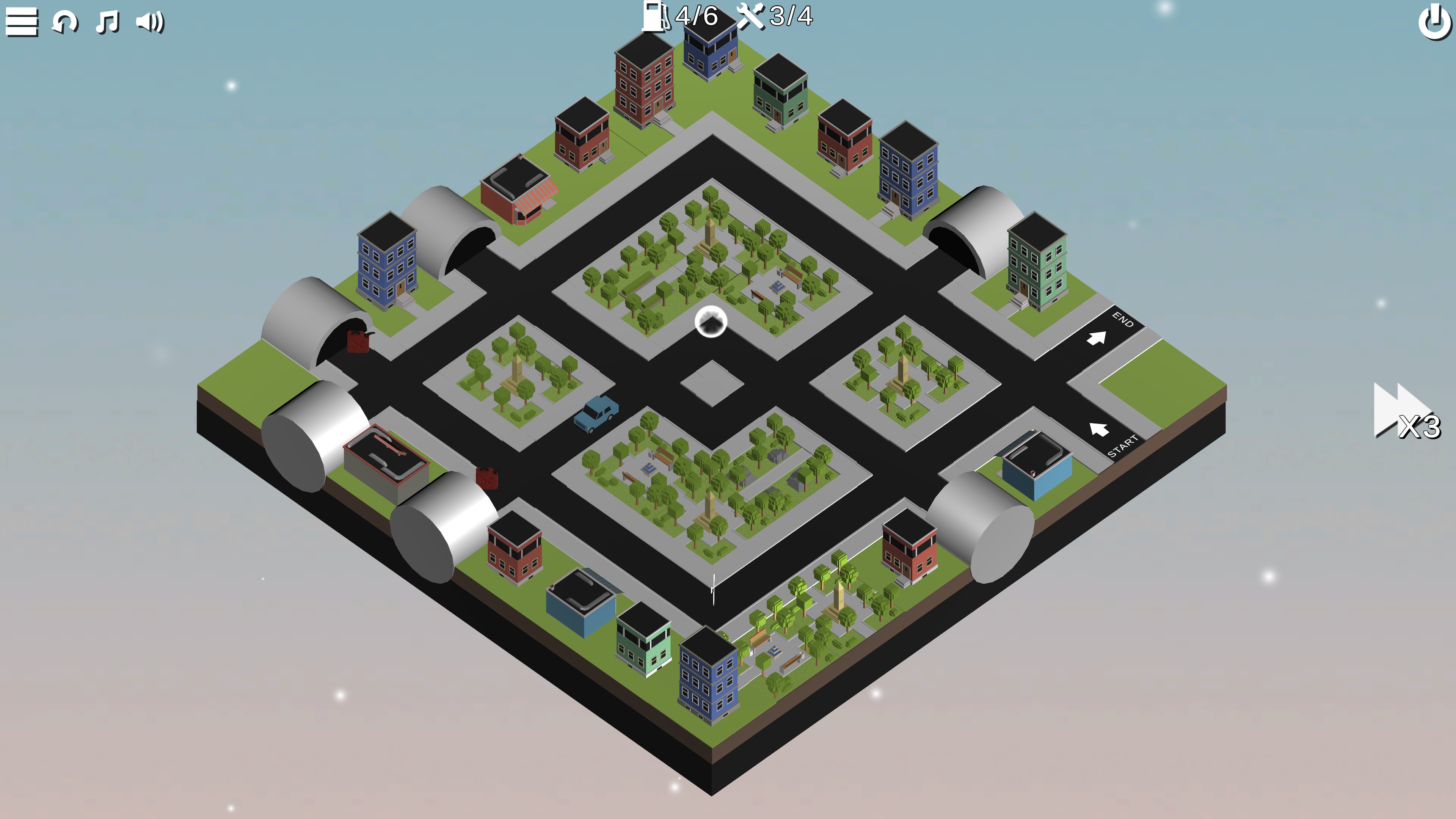 The visuals of Puzzle Car border on minimalist with some extra detail added to give life to the city. Tiles pop up in response to the player and the currently selected piece will stay hovering until swapped or deselected. The one visual I wish had more information was the tunnels. Players can only see which tunnel openings are pair together when hovering over them, making it necessary to memorize tunnel pairings. This becomes a lot of back and forth checking later in the game when having more than a dozen tunnel openings isn’t too unusual.