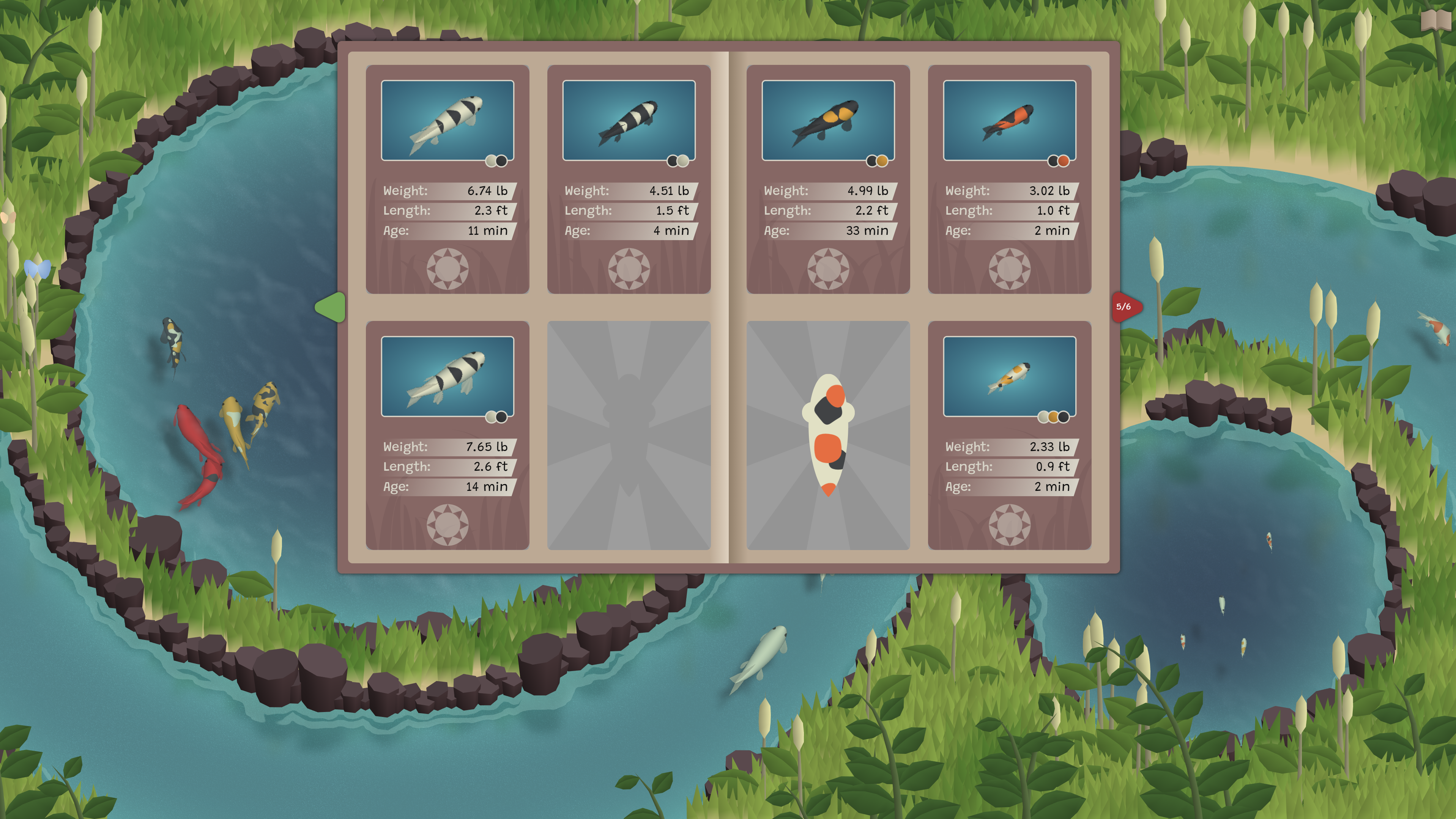As a collector-type player, my instant desire was to collect one koi of every color and base pattern combination in the game. Nevermind that that’s over one thousand fish for the two-color koi alone, the goal of the game for me would very much be tracking and completing such a collection. Unfortunately, the in-game catalog doesn’t allow for tracking how many of the possible variants have been found, let alone provided enough space for players to store all such fish for their own tracking purposes. This was a big letdown for me as I’d have loved to have a tab for every base color to fill up with all my beautiful koi. Instead, my large pond became very crowded and it was hard to find fish I needed so I stopped playing once I unlocked all the pages in the catalog that I could.